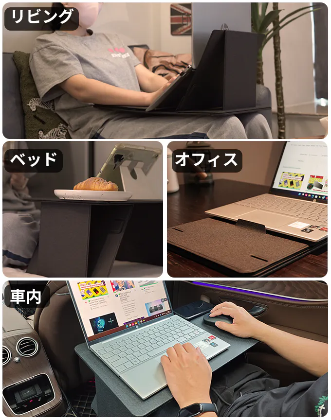 例えば、ソファでの映画鑑賞やベッドでの読書の際には、理想的なリラックススペースを提供し、デスクのように安定してノートPC作業のサポートもしてくれます。