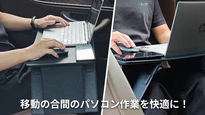この小型テーブルは、車内でも使いやすいです。座席に座った状態で膝の上に置くだけで、どこでも簡単に安定した作業スペースが確保できます。また、折りたたみ式なので、使わないときはサッと片付けられるため、車内での持ち運びや収納にも便利です。