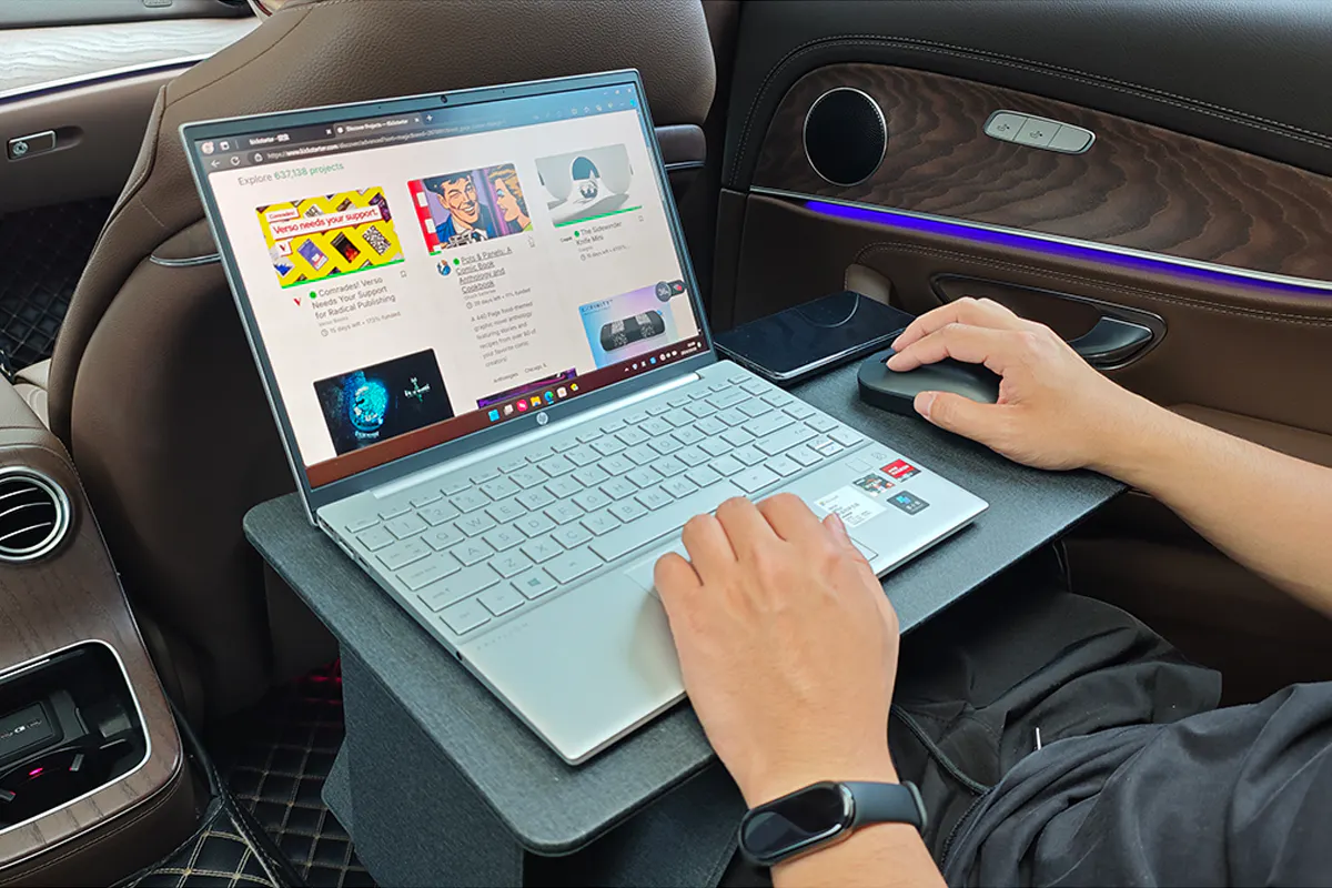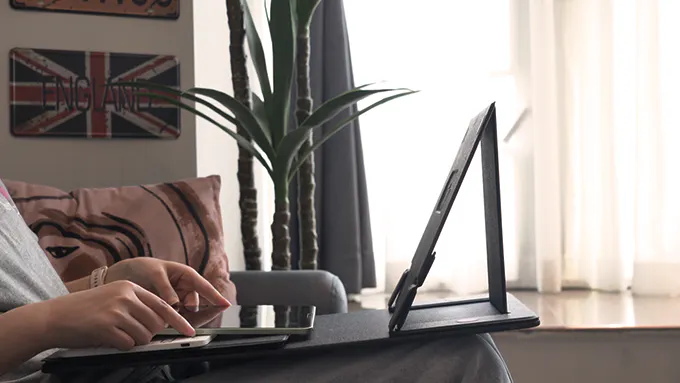 ②どこでも簡単設置!ソファ、ベッド、カフェ、車内など、あなたの好きな場所で快適な作業環境をすぐに作れます。