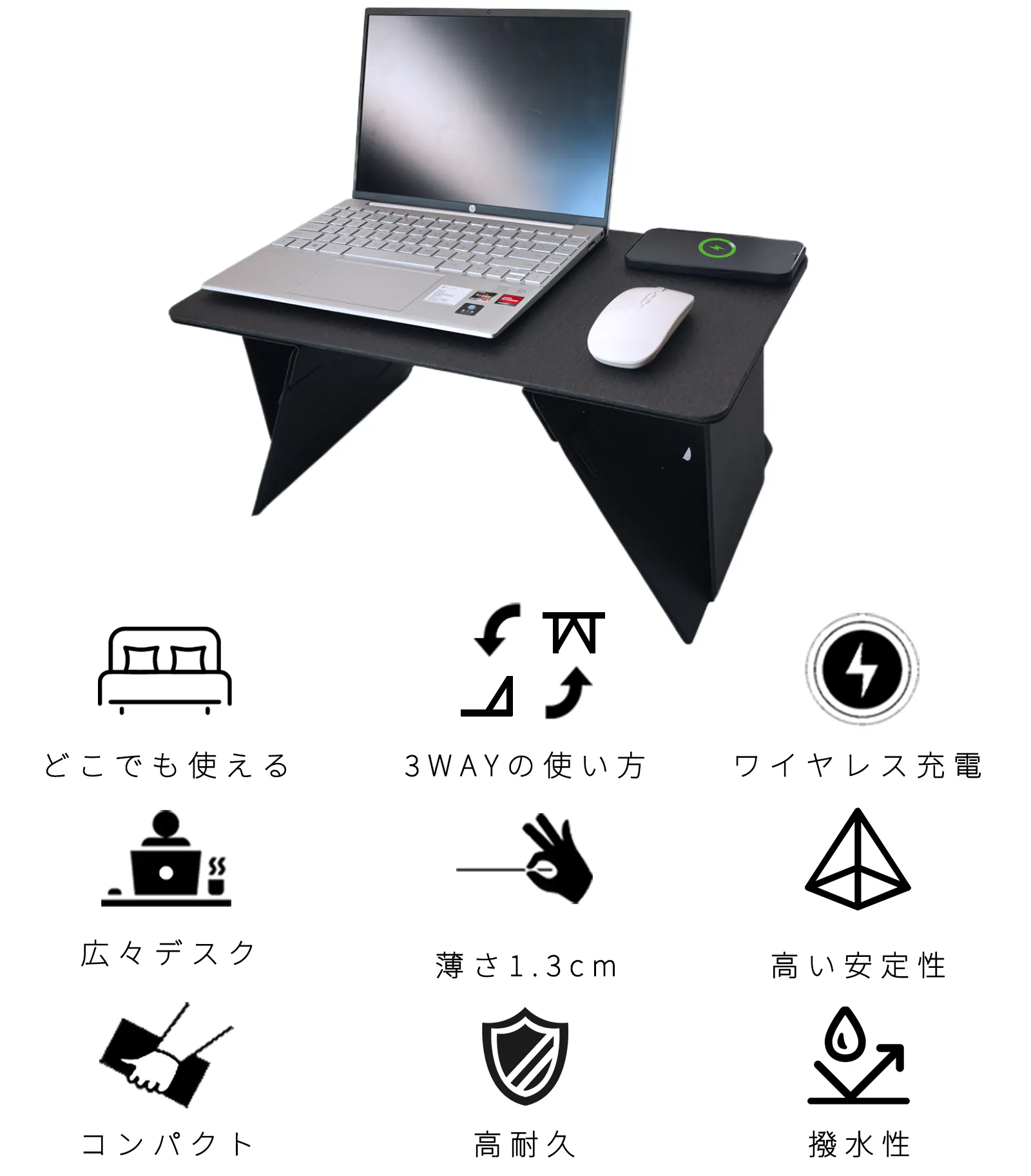 ①1台3役!テーブルマット、ベッドテーブル、PCスタンドとして使用でき、姿勢改善にも効果抜群です。