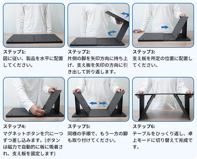 長時間の座り作業に疲れたときには、折りたたみテーブルを立ててスタンディングデスクとしても使用可能。姿勢改善や肩こり・首の負担軽減に役立ち、健康的な働き方をサポートします。