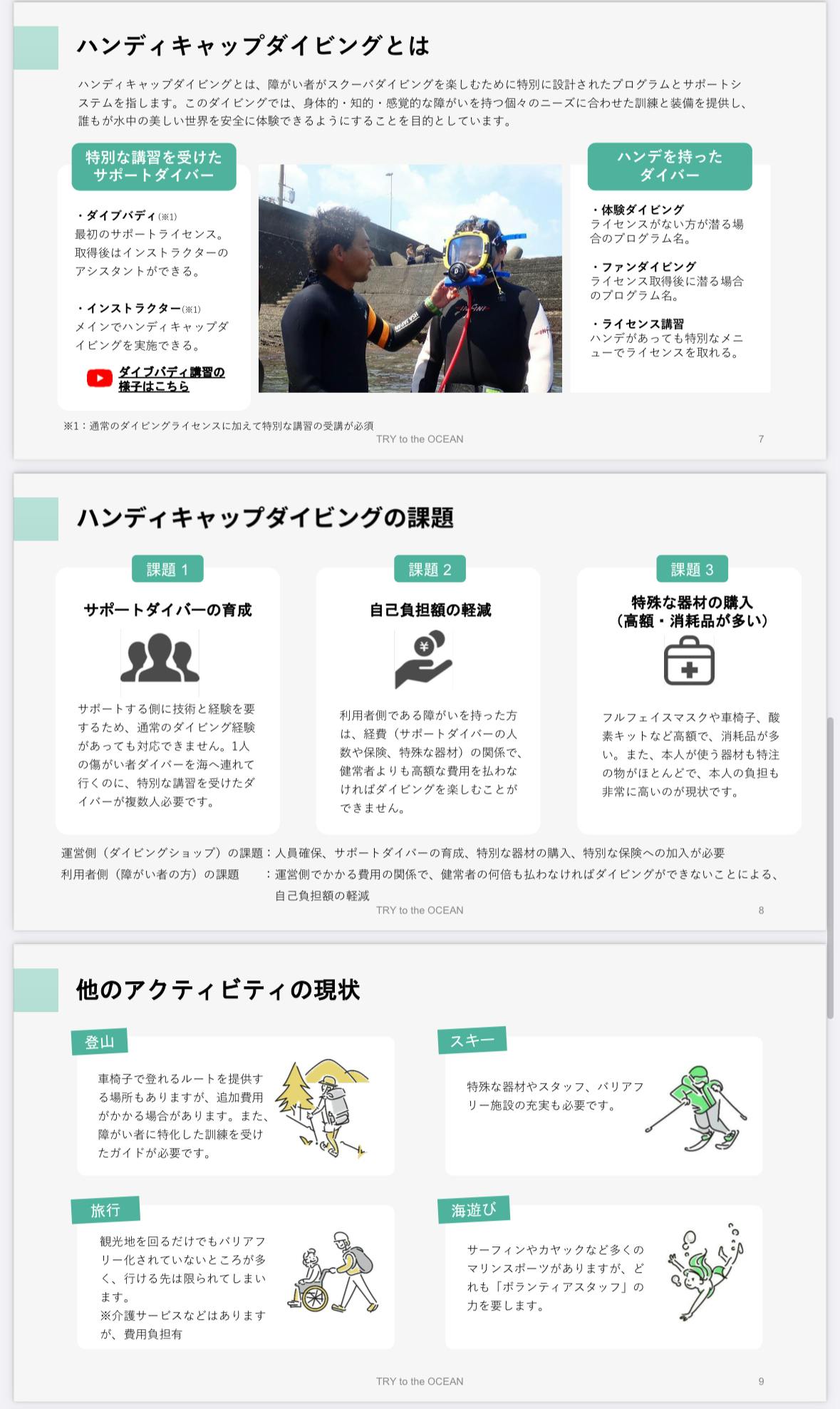 TRYでは、海を想う人たち全員が手を取り合って、障がいがあってもなくても勇気ある誰かの「TRY(チャレンジ)」を応援する仕組みを作って行きます。