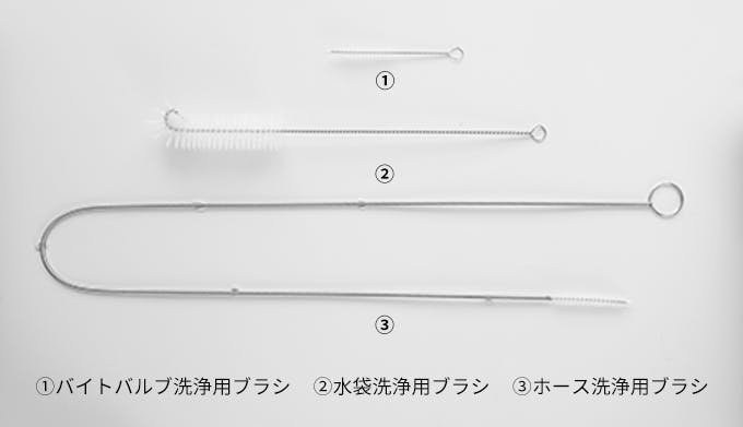 水袋自体はスポンジと食器用洗剤を使って洗うこともできます。ホースとバイトバルブの細かい部分も同梱のブラシで簡単に清掃可能です。