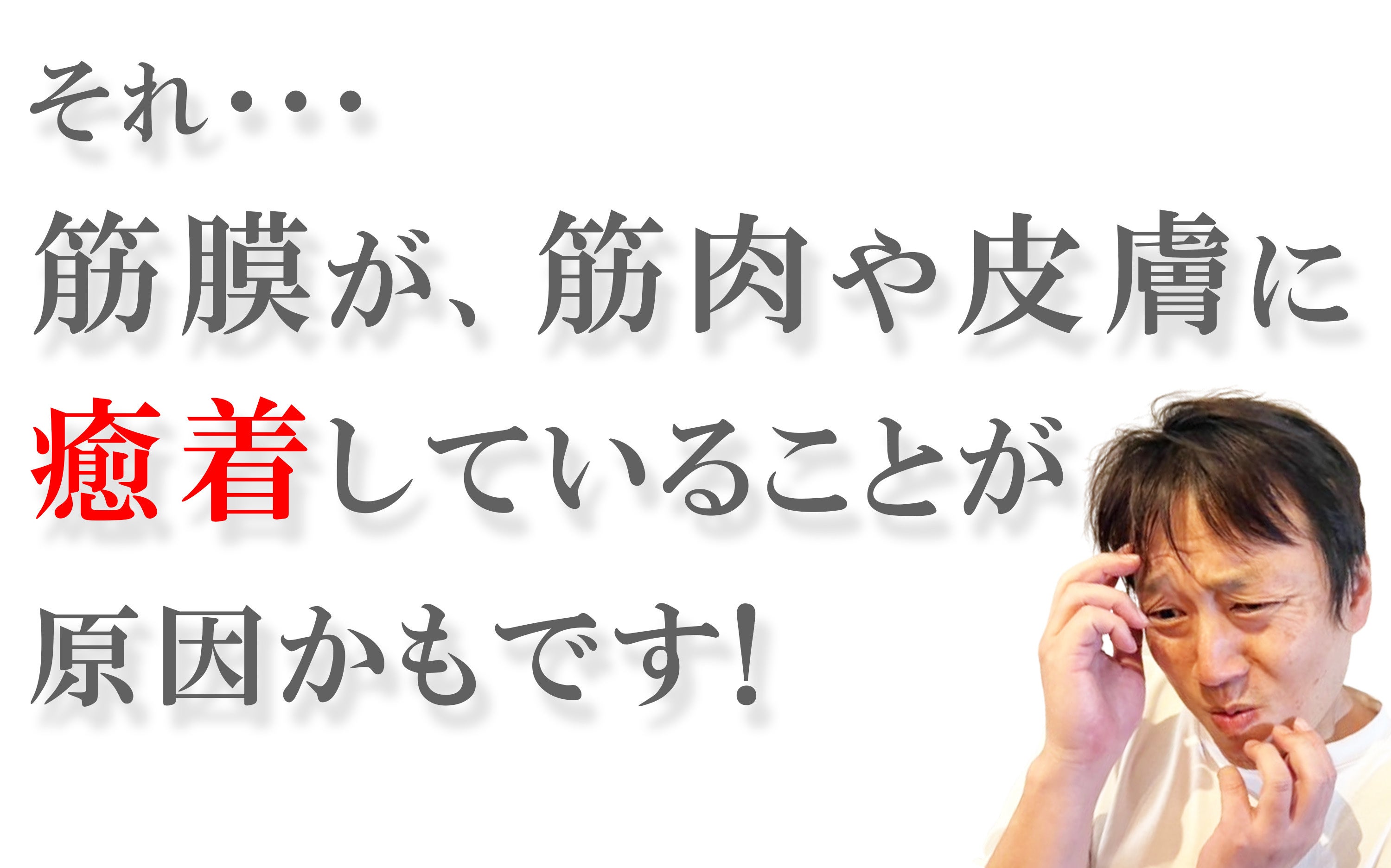 「筋膜の癒着」とは、筋膜の成分が一部分に偏り接着剤のように、隣接している筋肉・皮膚にくっついて固くなってしまった状態のことをいいます。