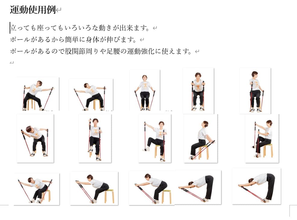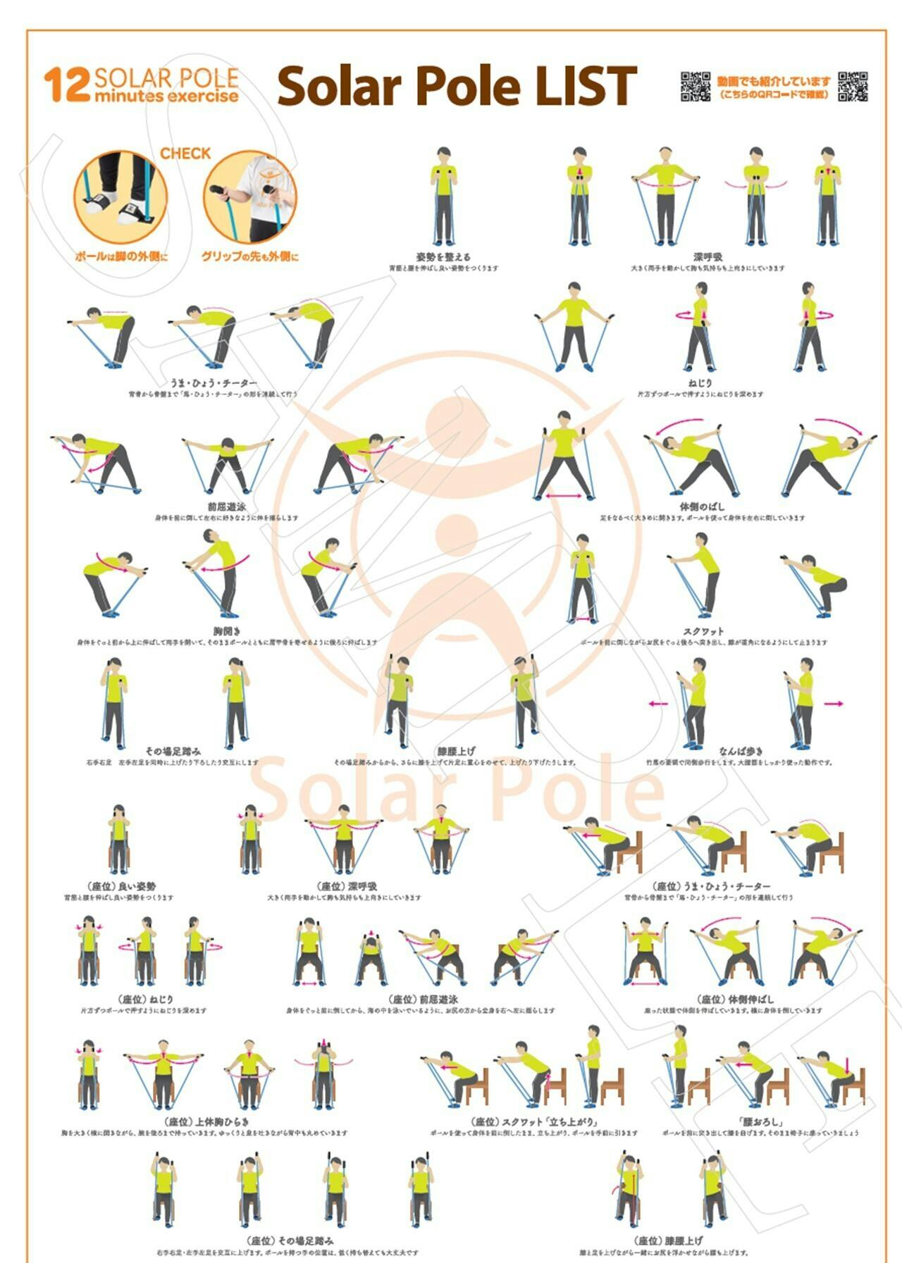 購入時にソーラーポール体操表(A2サイズ)を同梱しています。QRコードをつけていますのでそれを見ながら行ってください。なお、足腰に不安のある方は、椅子に腰かけて使用されることをおすすめしています。