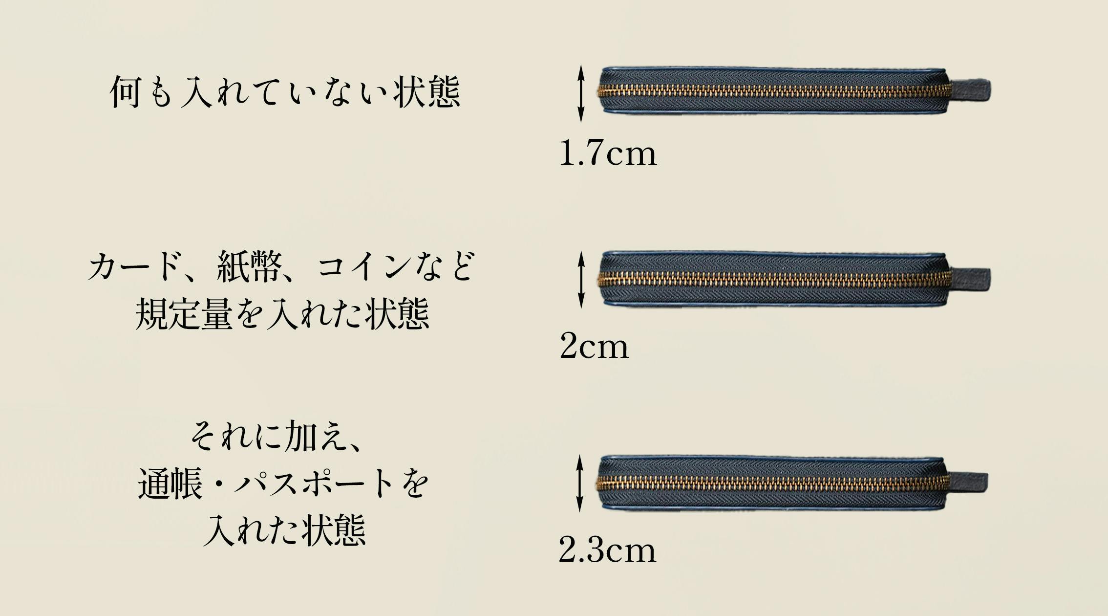 A. お財布に入れているカード等の容量と、挟むものの大きさによっても可能な厚みが変わってくるため、一概には言えないのですが、カード等を規定通りに入れた場合に形を崩さずにお使いいただけるのは約1cm程度です。