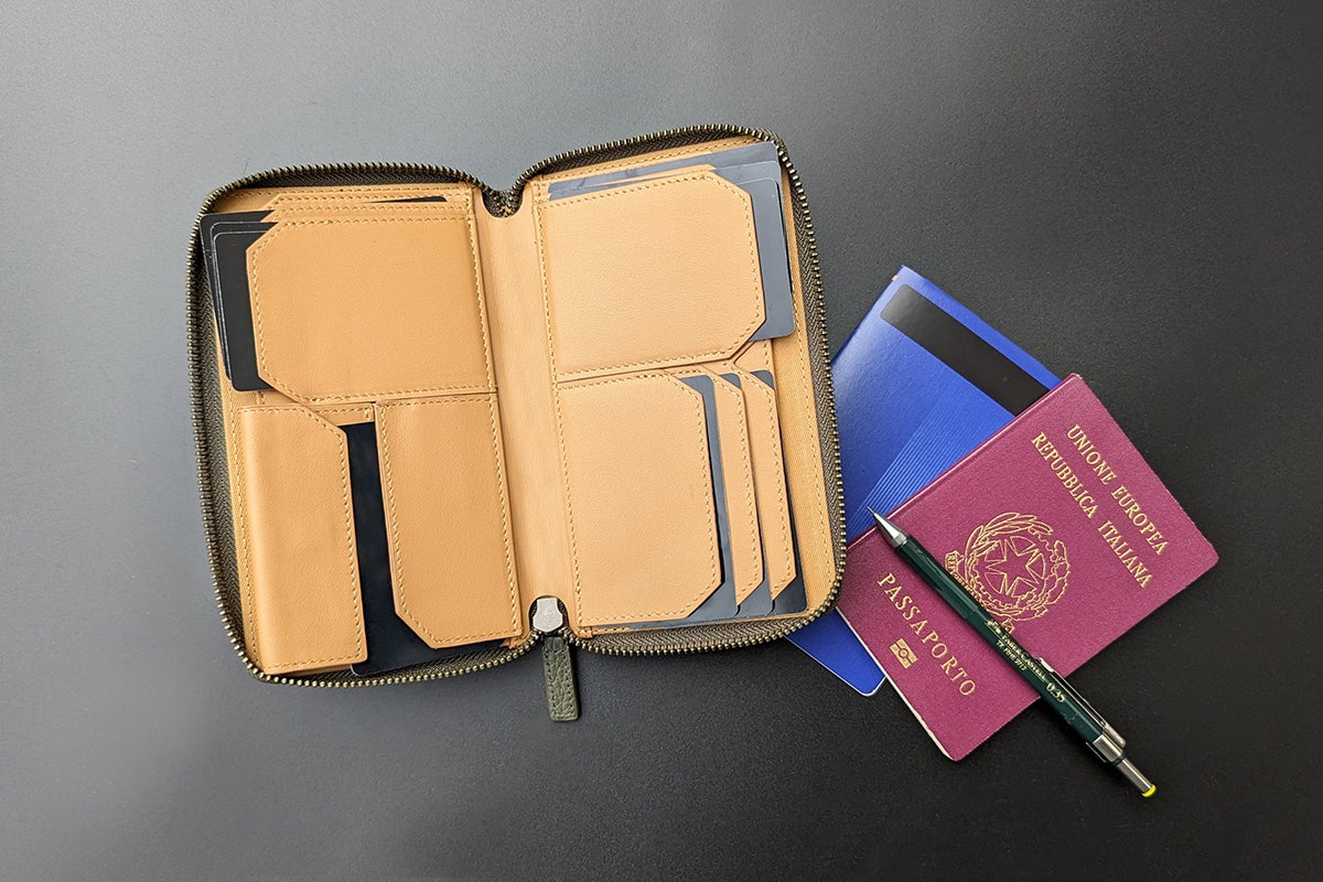 そして、フラットにもなる真ん中部分にはパスポートや通帳、スマートフォンやメモ帳、ボールペンetc...様々なものをはさんで持ち歩けます。