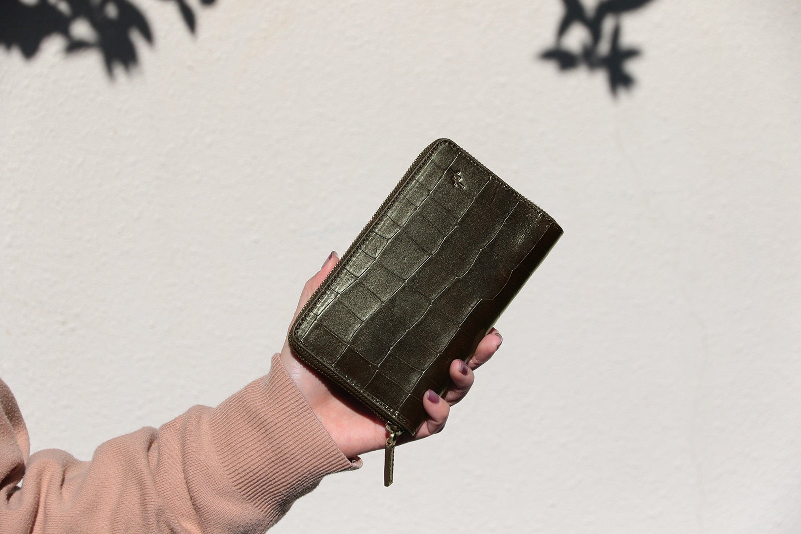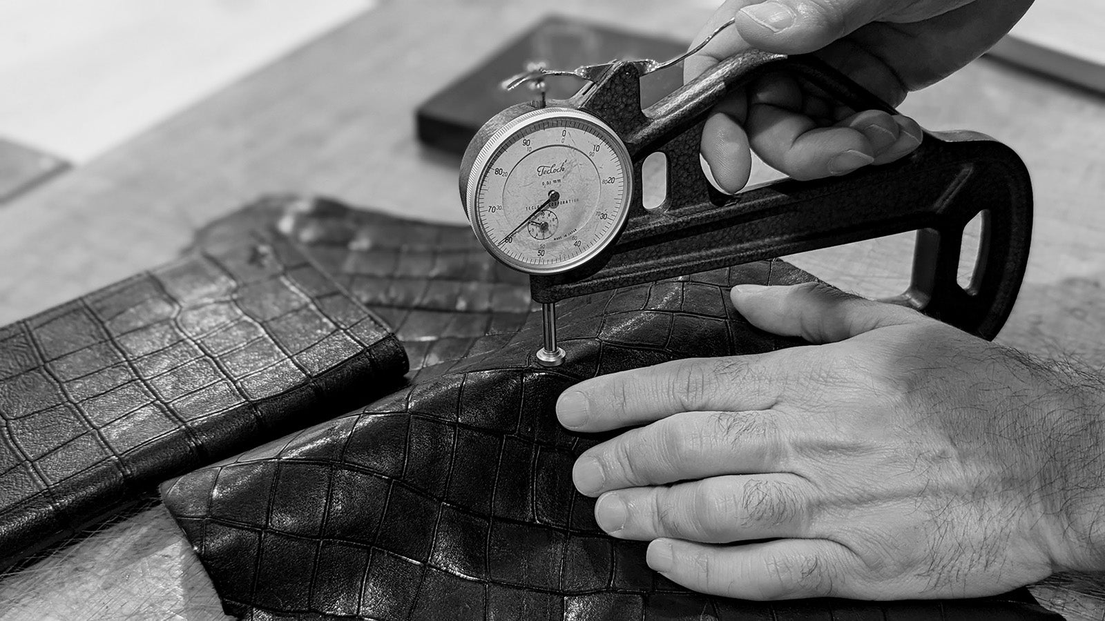という想いから、デザイナーがイタリアの革工場と手を組み、生み出したレザーは、イタリアの職人が手作業で仕上げる、クロコダイルの美しい表面感を持つ、環境に優しいベジタブルタンニンレザー "Coccodrillo(コッコドリーロ)"でした。