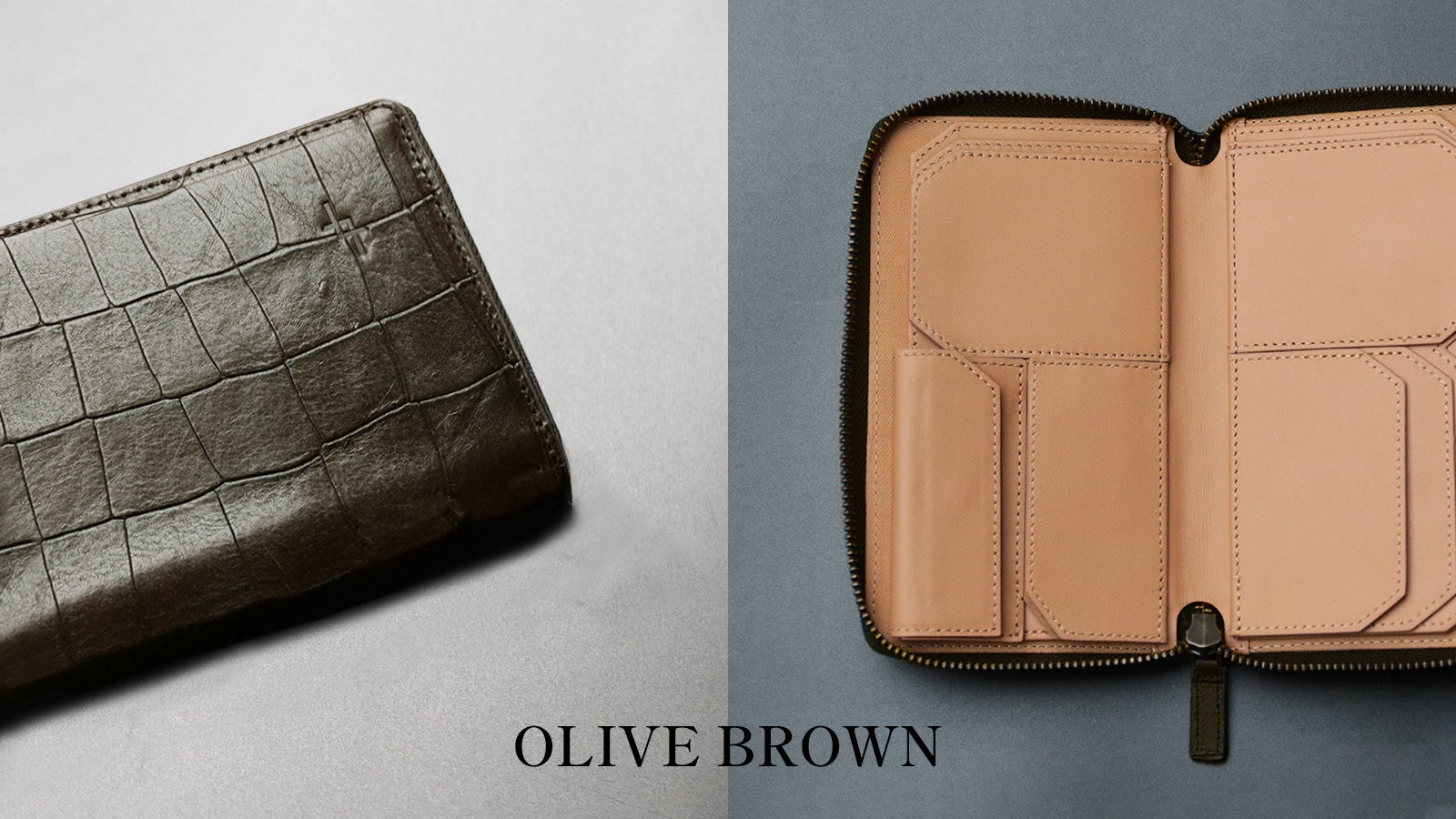 深みのあるグリーンとダークブラウンを掛け合わせたような、絶妙なカラーリングが特徴。角度や光の種類、部位によっても色が違って見える奥行きのあるカラー。エイジングが一番楽しめる、使うほどに成長していくカラーです。美しく、見やすいヌメ色のインナーレザーとのコンビネーションです。