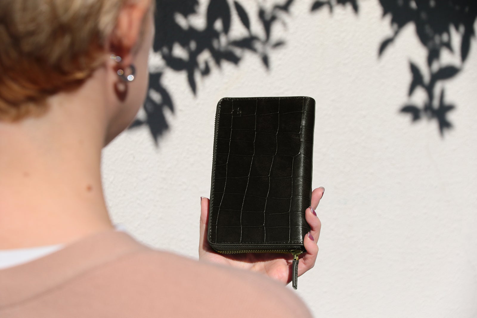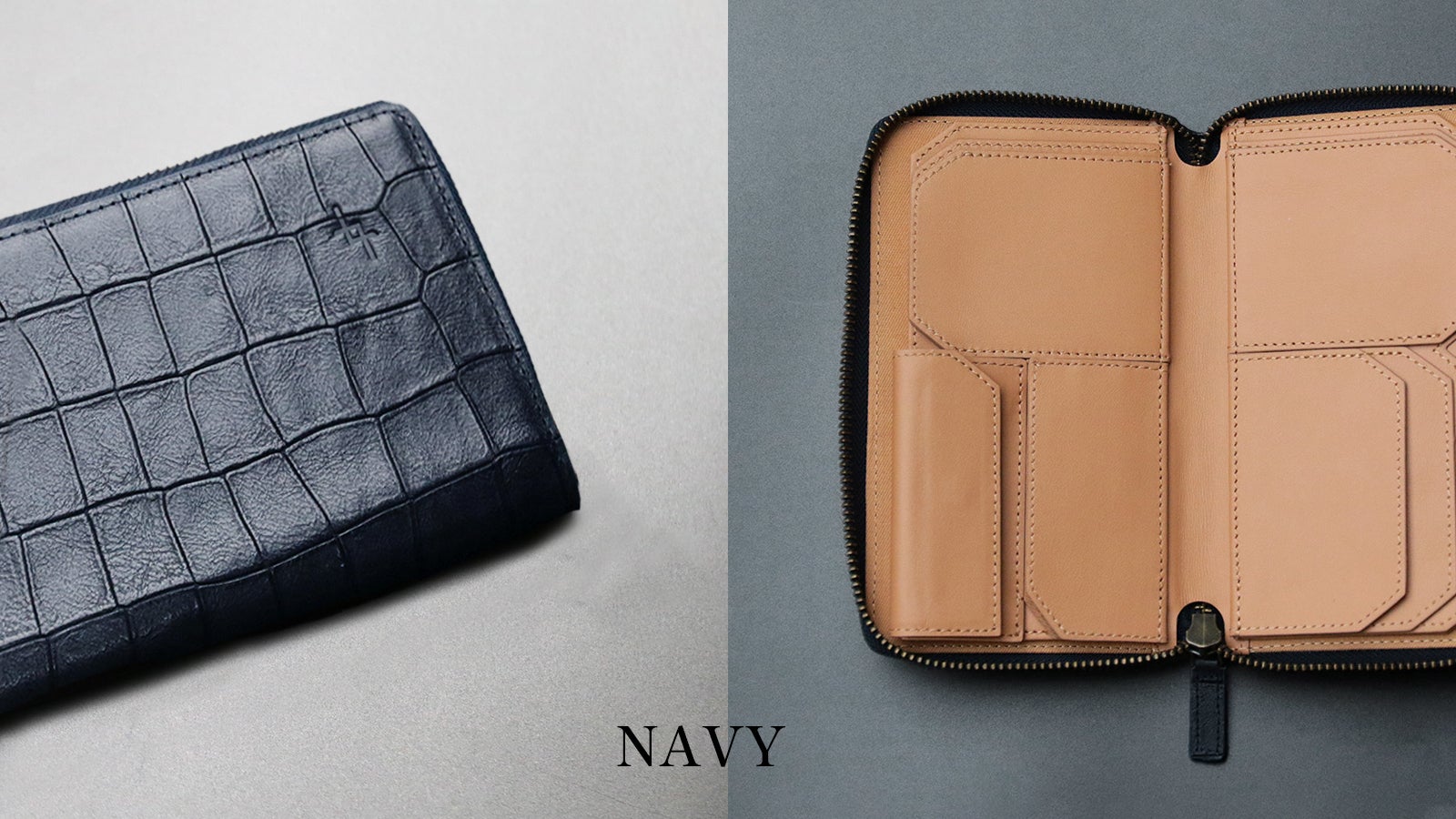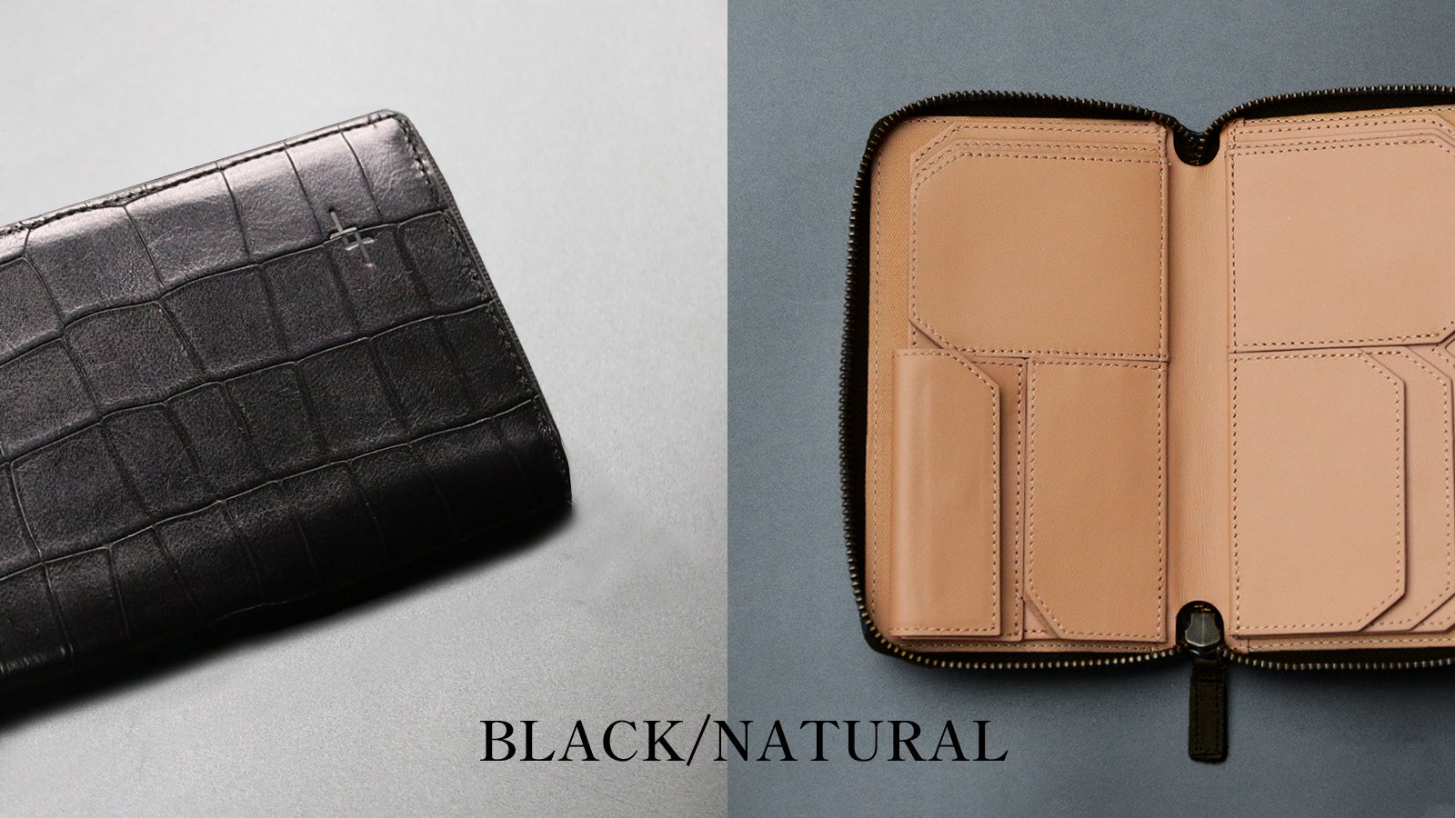 一番ベーシックだからこそ、革の質が最も問われるBLACK。美しい艶とクロコダイルの柄が一際引き立つカラーです。美しく、見やすいヌメ色(NATURAL)のインナーレザーとのコンビネーションです。
