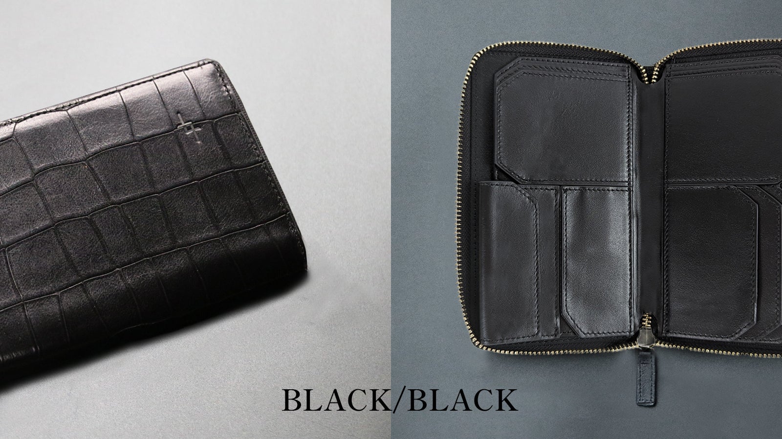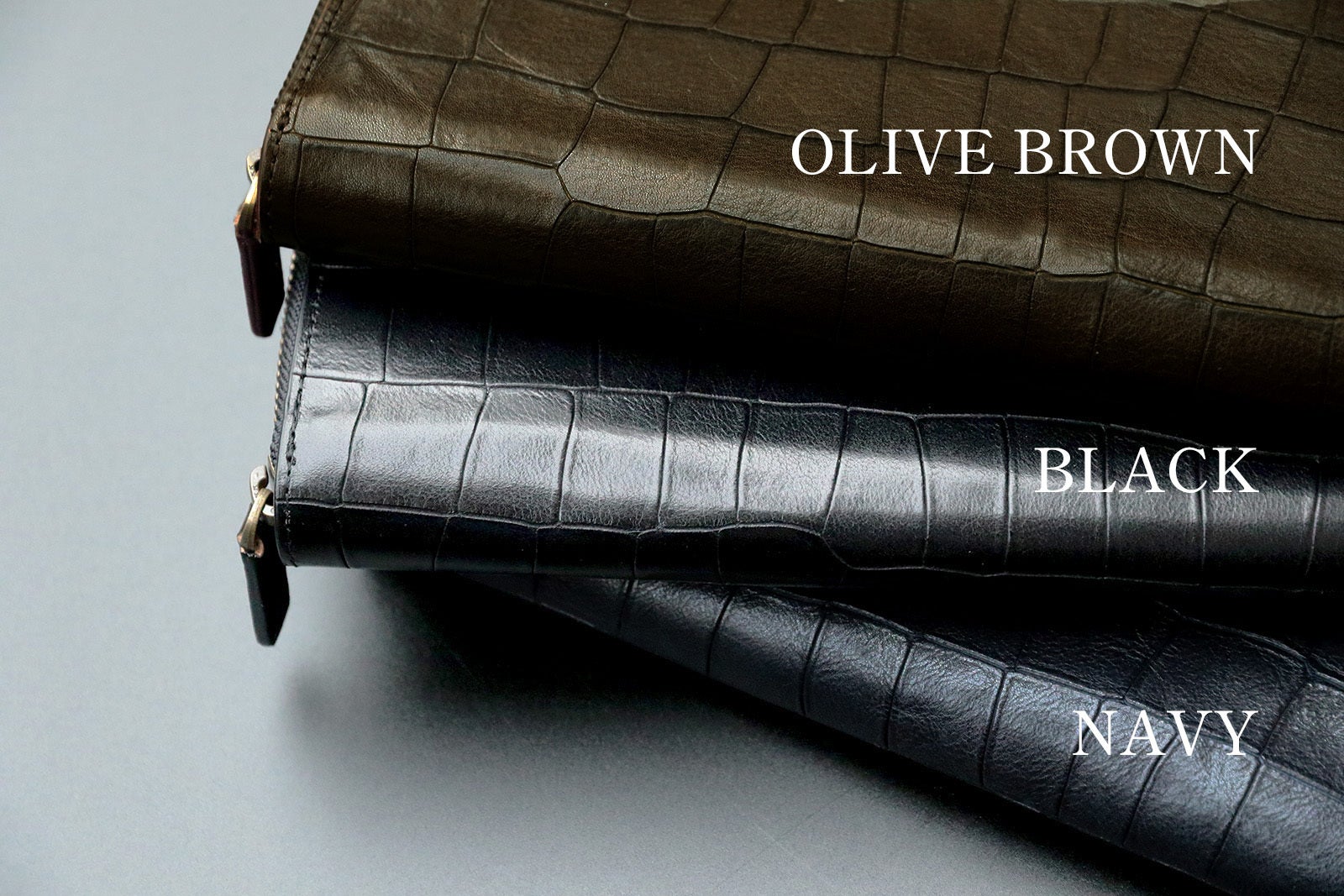 一番ベーシックだからこそ、革の質が最も問われるBLACK。美しい艶とクロコダイルの柄が一際引き立つカラーです。美しいBLACKスムースのインナーレザーです。