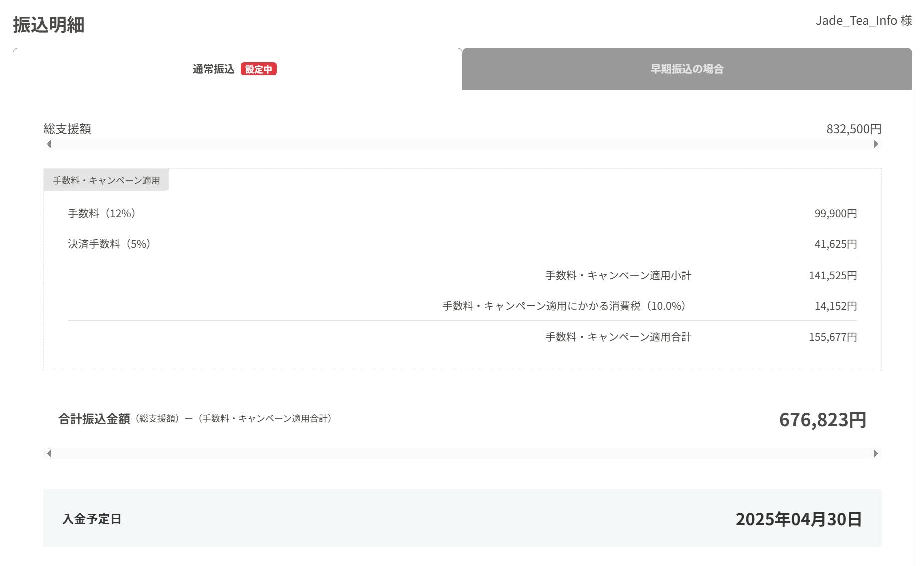 今回のご支援金は、CAMPFIREへの手数料17%と消費税を除いた額「676,823円」がわたくし紅屋の元へ納められます。