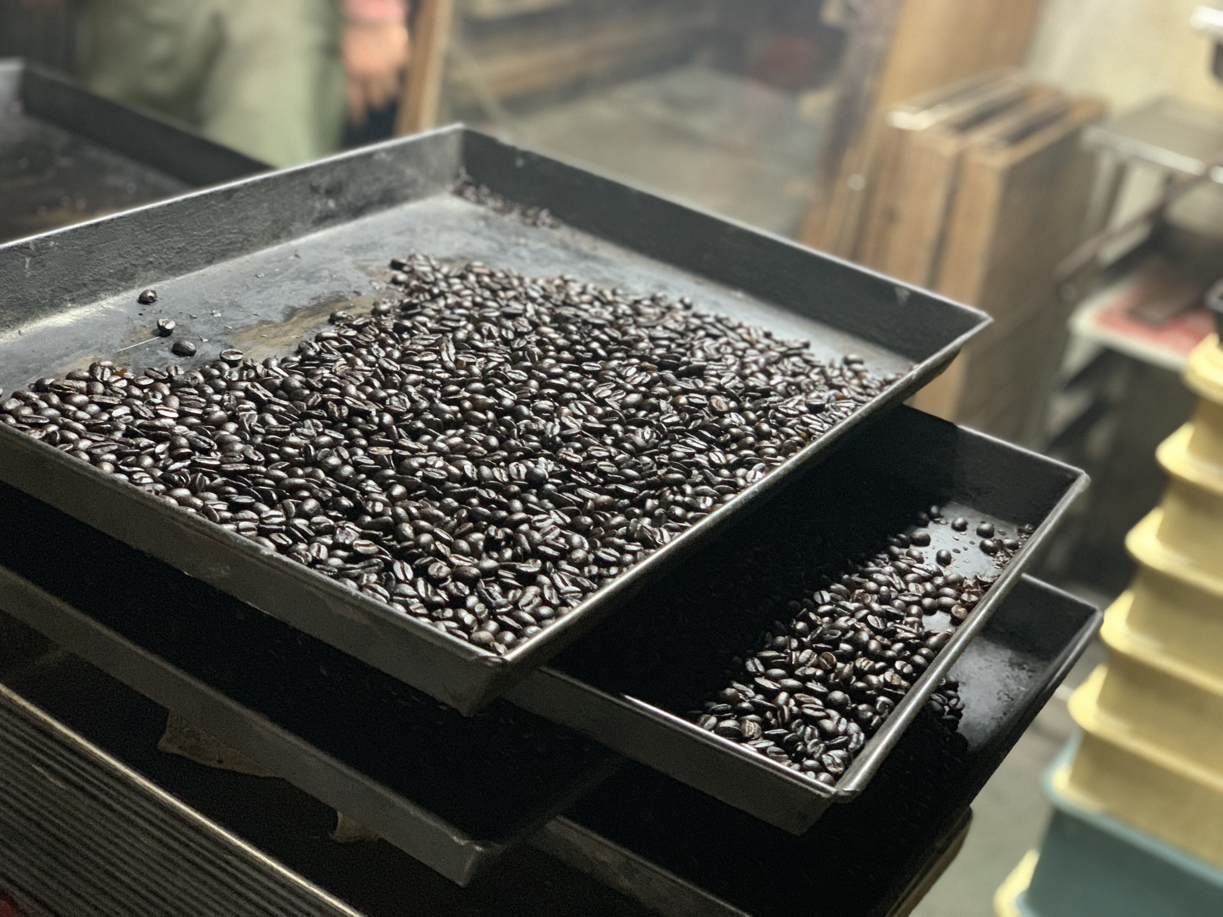 何度も窯から出しては混ぜてを繰り返し深煎りに焙煎、コクが深く