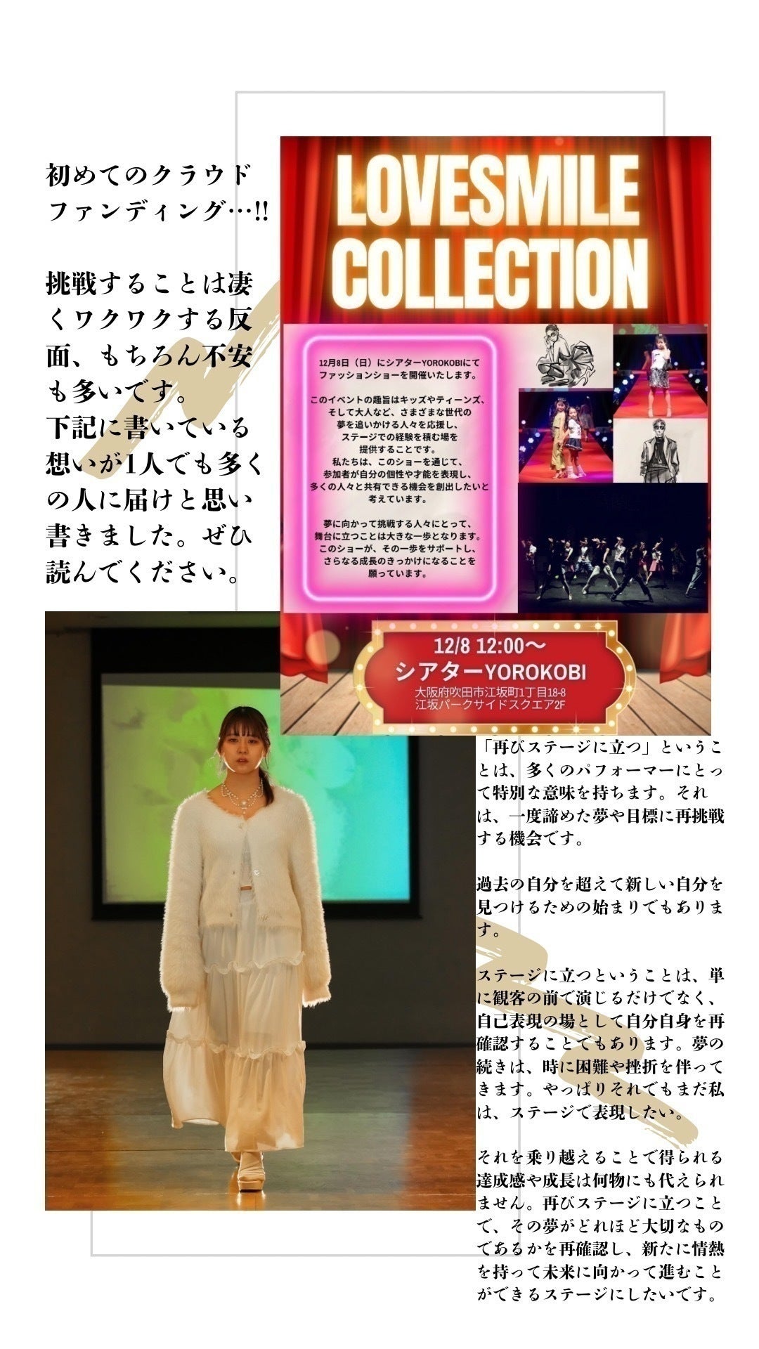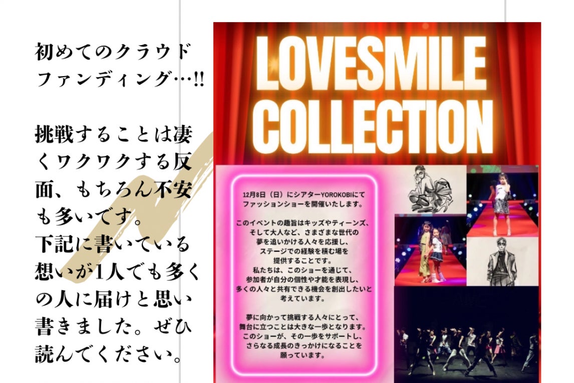 【LOVE SMILE collection by Rina Shindo】というファッションショーに出演し、新たなステージで自分の可能性を広げたいと考えています。このショーは私にとって、これからのスタートであり、次のステップに進むための重要な機会です。皆様のご支援を受けて、エントリー費用および遠征費を確保し、夢のステージに立ちたいと思います。