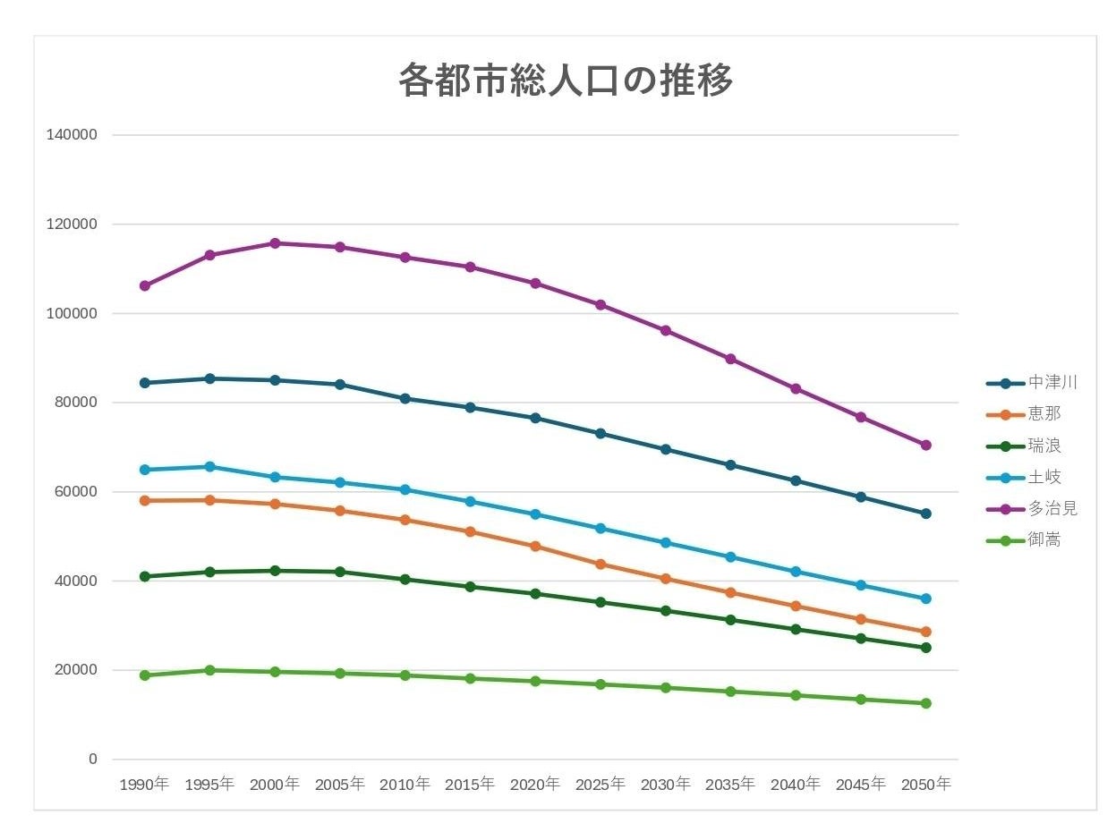 東美濃エリアは、それぞれの地域で近年人口減少が続いており、今後ますます人口は減っていくと言われています。また、各地域で共通して高齢者の人口が増えていく一方で子どもの数は減っており、少子高齢化が進んでいる現状です。