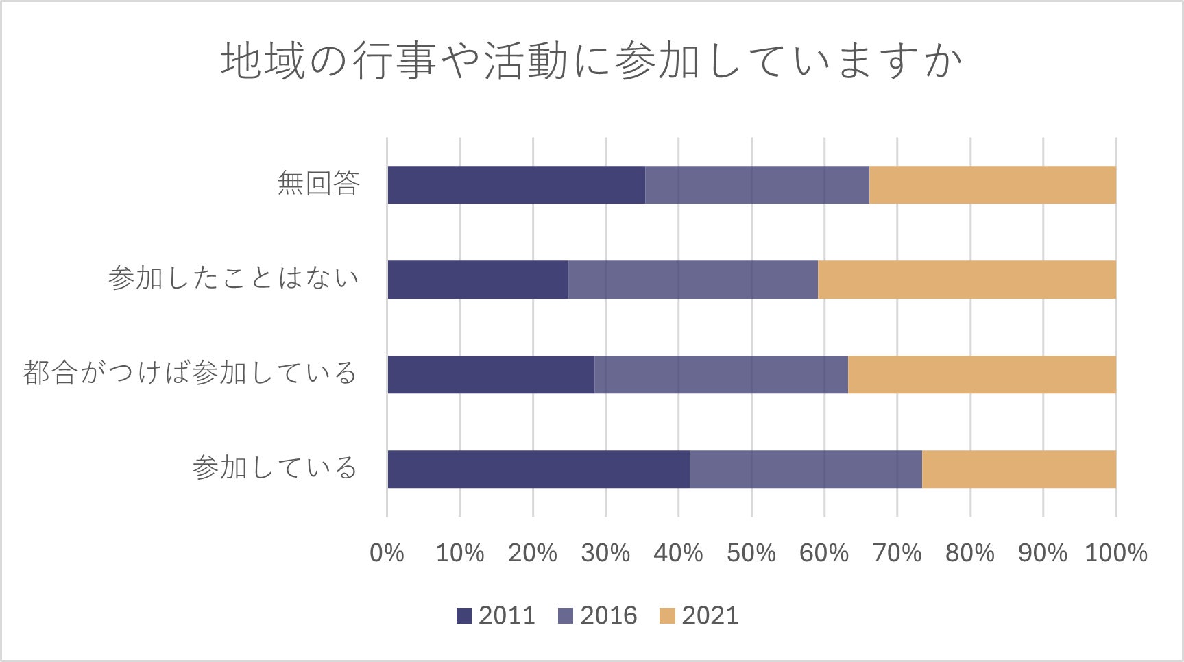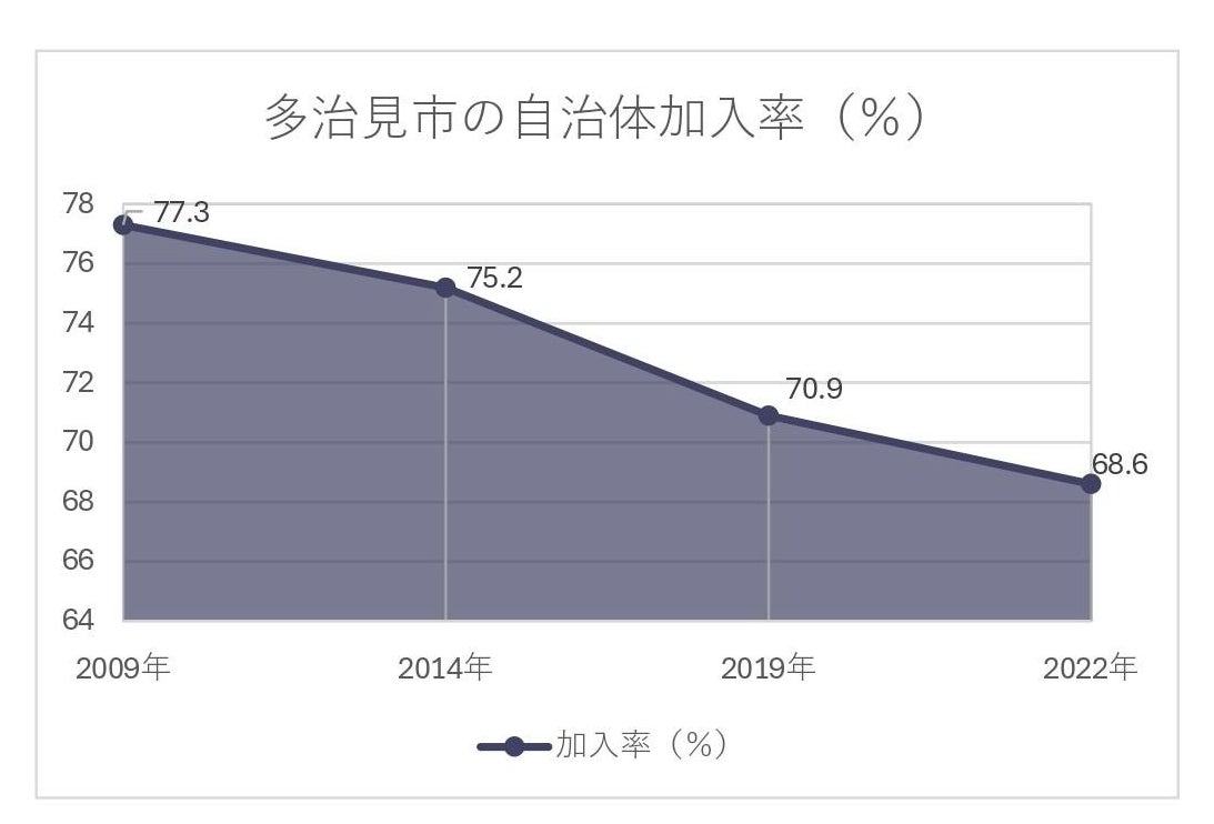 例えば、地域コミュニティにおいて重要な役割を担っている自治会の加入率も年々減少しており、祭りや運動会などの行事も継続して行うことができない現状が挙げられます。