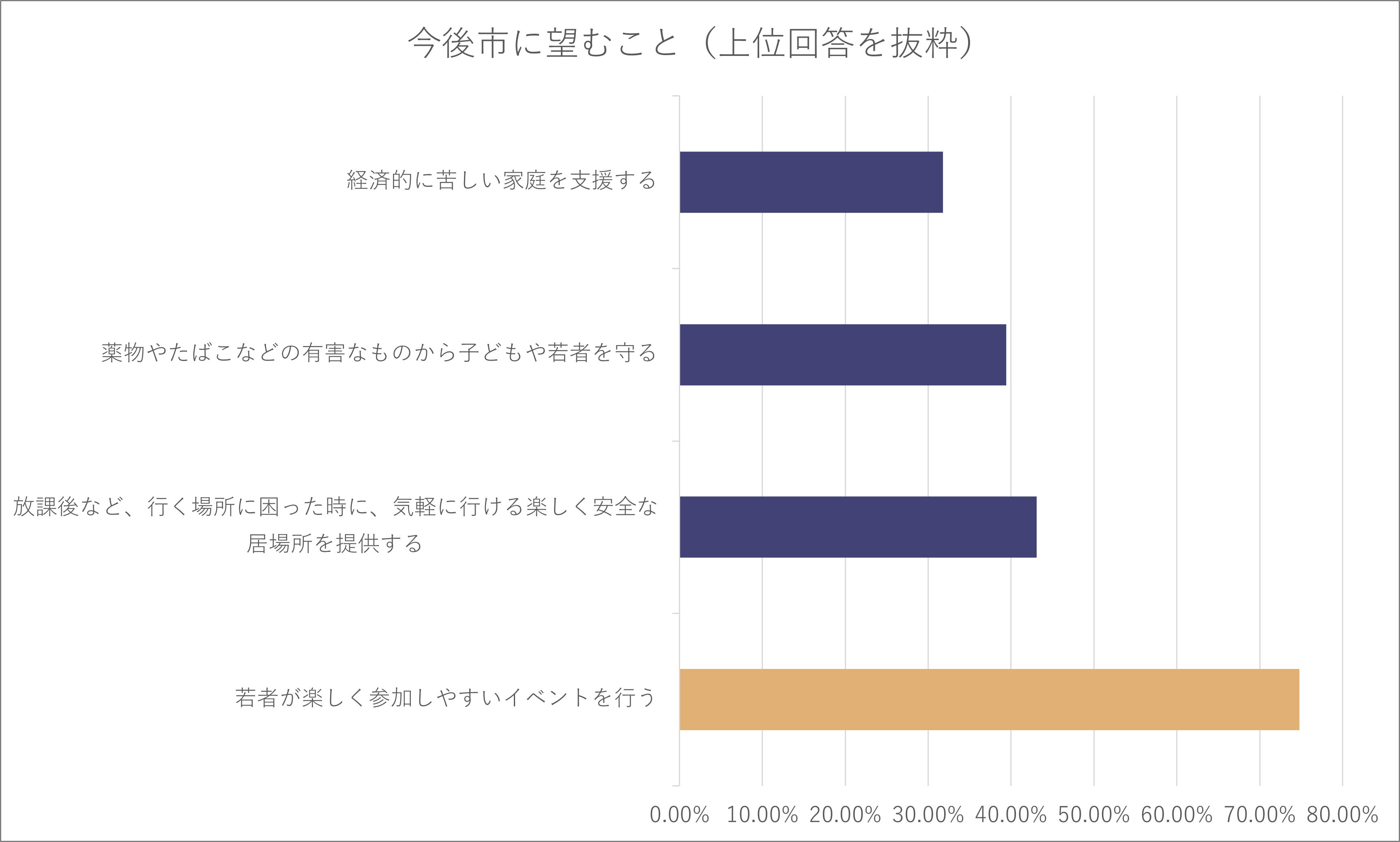 このように、少子高齢化から地域のつながりが必要となっている現状を受け、瑞浪市では、子どもが今後市に望むこととして「若者が楽しく参加しやすいイベントを行う」という回答が74.9%で最も多い結果となっています。