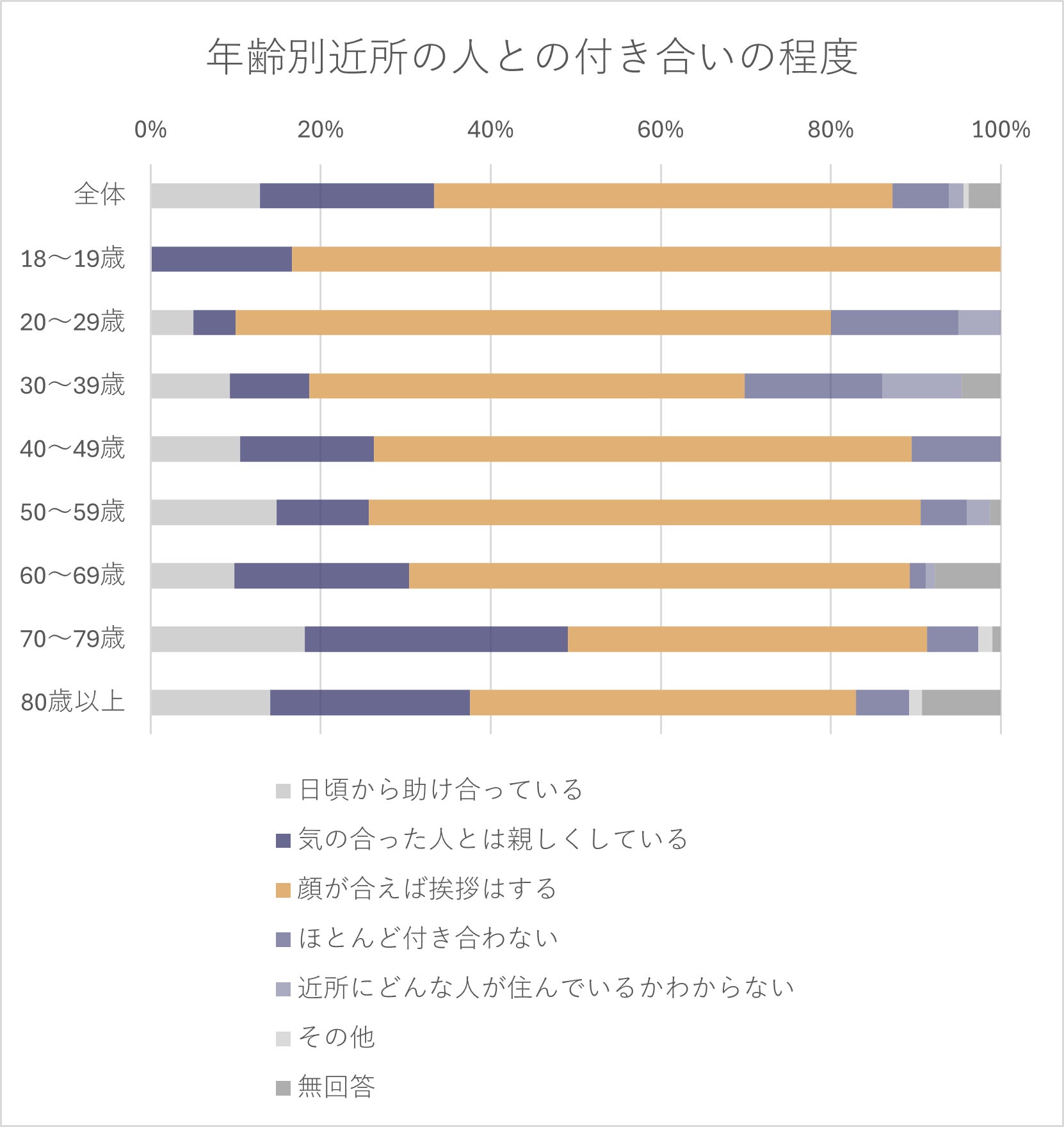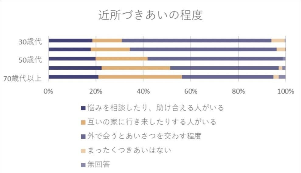 また、御嵩町のデータでは年代別に見た近所づきあいの程度についてのアンケートにおいて、どの年代も「顔が合えば挨拶はする」人の割合が高く積極的に地域間での関わりを持っている人は少ないといえます。