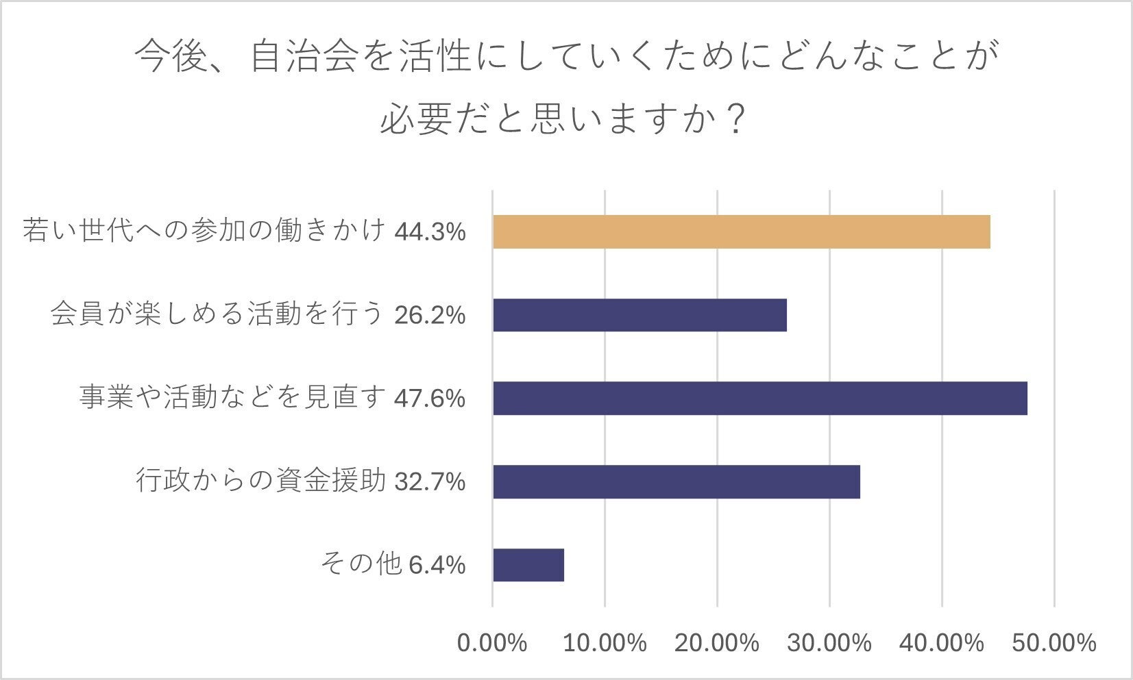 さらに、恵那市では「今後、自治会を活発にしていくためにどんなことが必要だと思いますか?」というアンケートに対して、「若い世代への参加の働きかけ」44.3%・「会員が楽しめる活動を行う」26.2%という結果になっており、将来を担っていく若い世代を巻き込むような楽しいイベントを開催することへのニーズが高まっているということが言えるのではないでしょうか。
