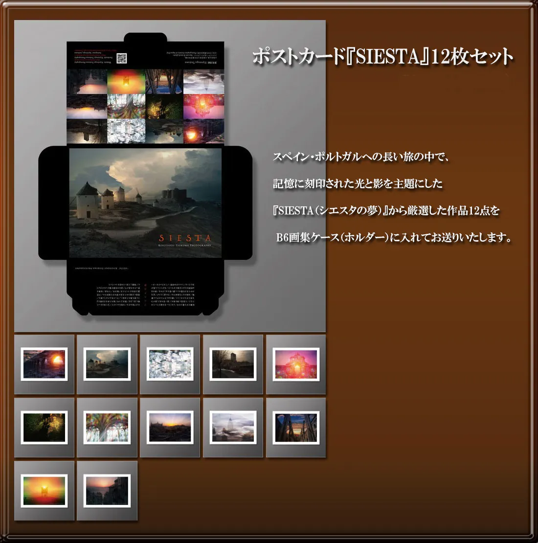 スペイン・ポルトガルへの長い旅の中で、記憶に刻印された光と影を主題にした『SIESTA(シエスタの夢)』から厳選した作品12点をポストカードにまとめ、 B6画集ケース(ホルダー)に入れ、ホルダー裏に直筆のサインを入れてお送りいたします。普通郵便でお届け先ご住所のポストに投函の形となります。よろしくお願い致します。