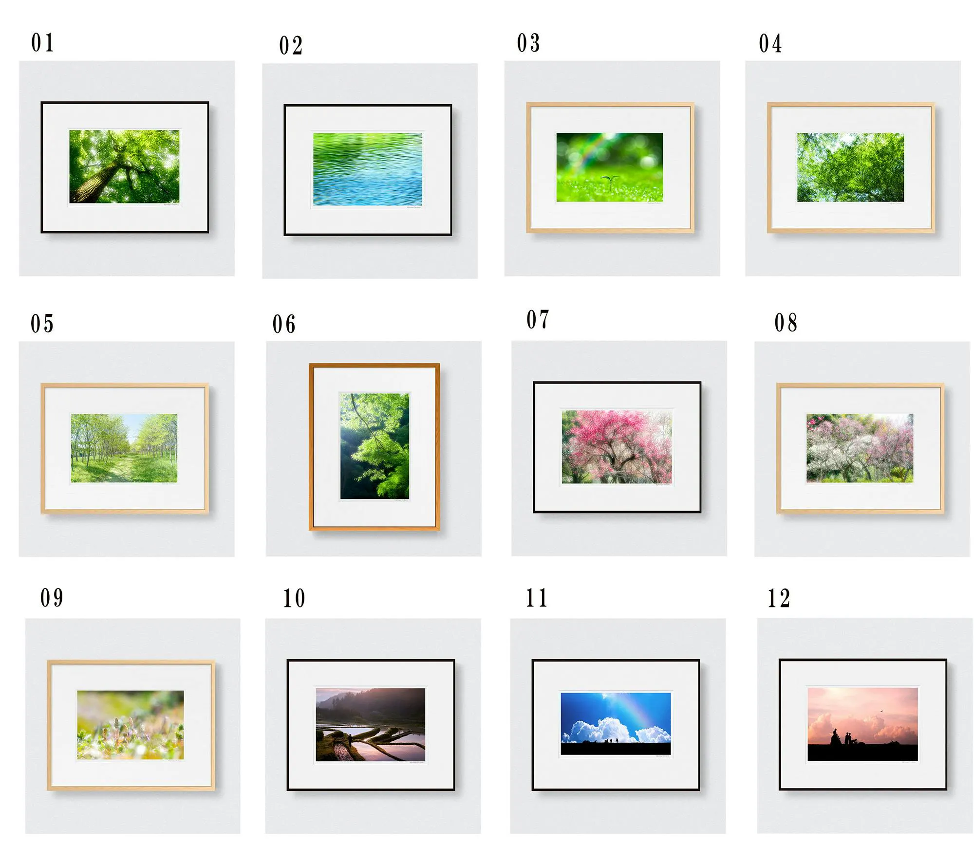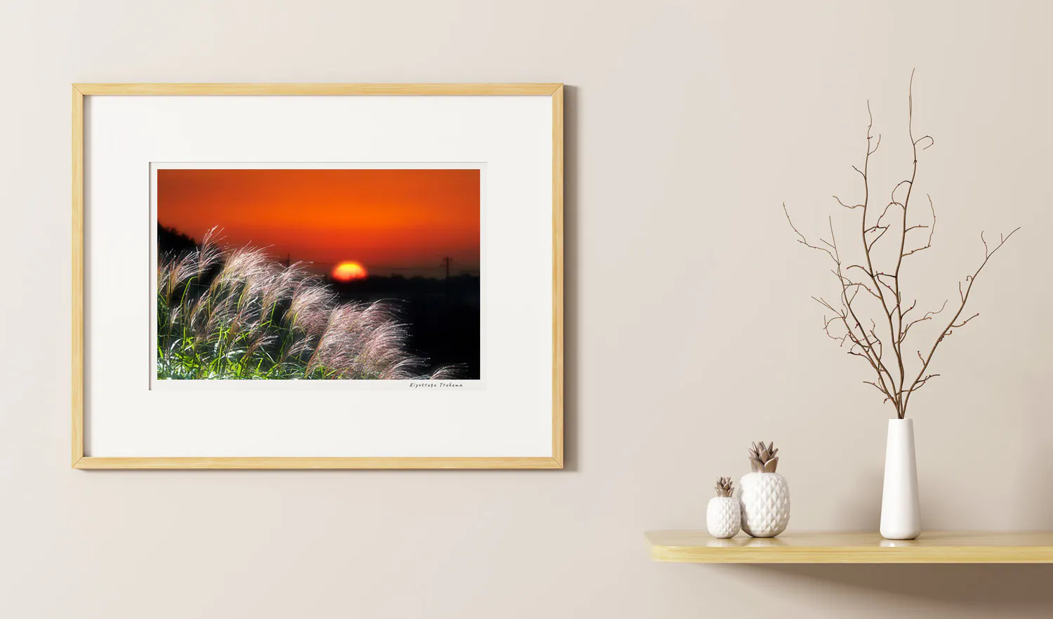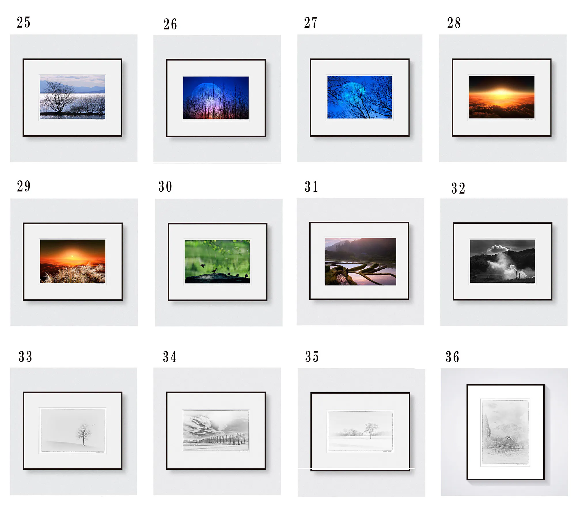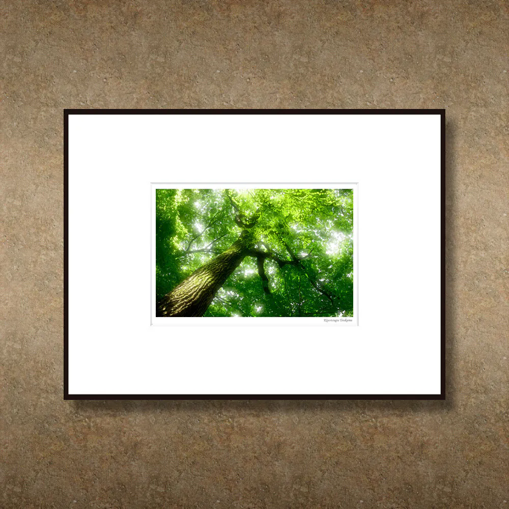 展示作品の中からお好みのものをお選びいただき、顔料インクで2L判(キャビネ)にプリントしたものを八切判サイズ(303㎜×242㎜)の高級フレームに額装し直筆のサインを入れお送りします。※額縁は在庫状況により本ページ掲載画像と異なる場合もございます。ご了承いただければ幸いです。