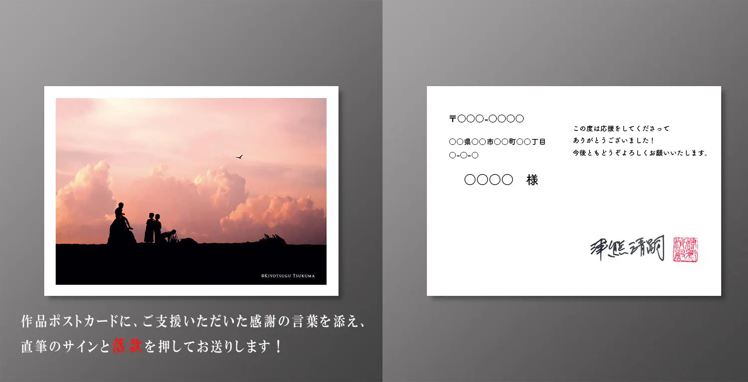 作品ポストカードに、ご支援いただいた感謝の言葉を添え、直筆のサインと落款を押してお送りします!