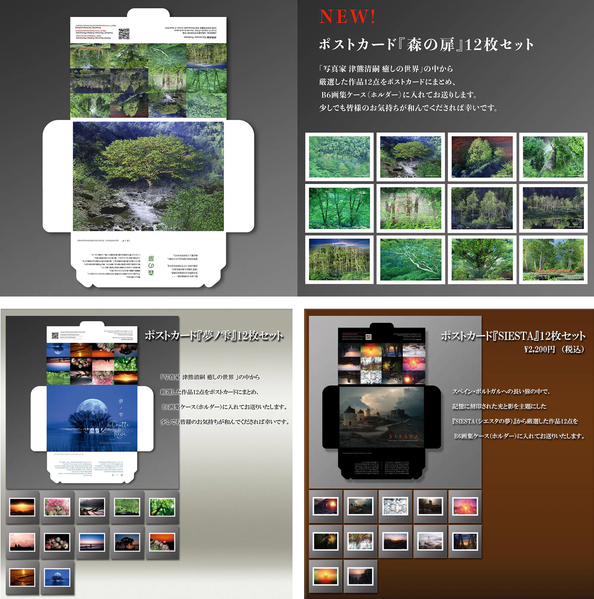 新作のポストカード『森の扉』、『夢ノ雫』、『シエスタ の夢』の3種セット。(各種12枚セット)