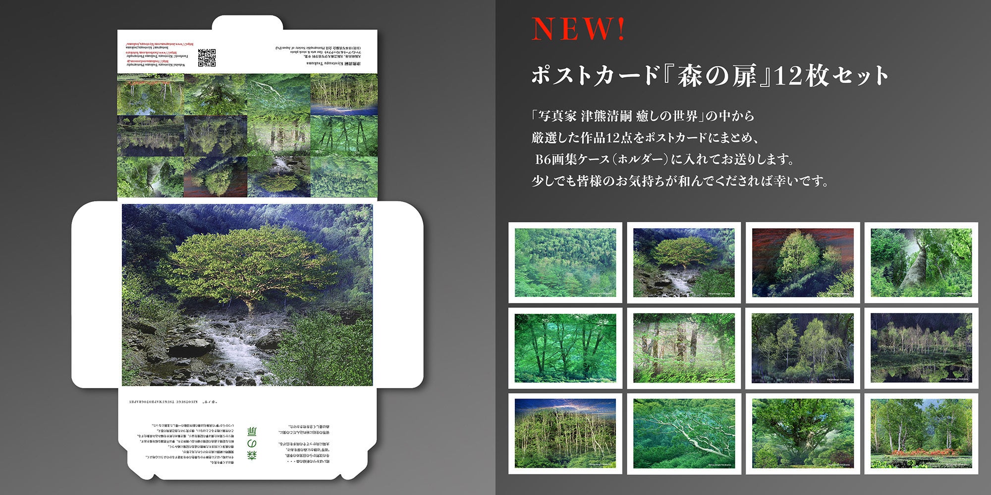 新作のポストカード『森の扉』、『夢ノ雫』、『シエスタ の夢』の3種セット。(各種12枚セット)
