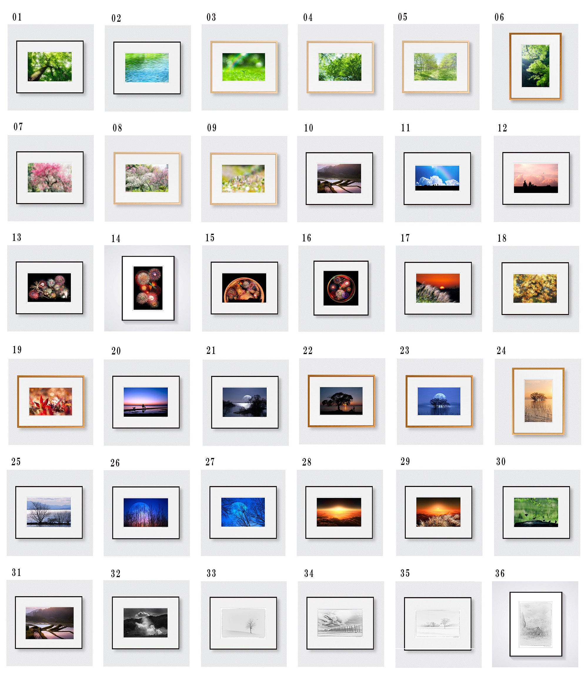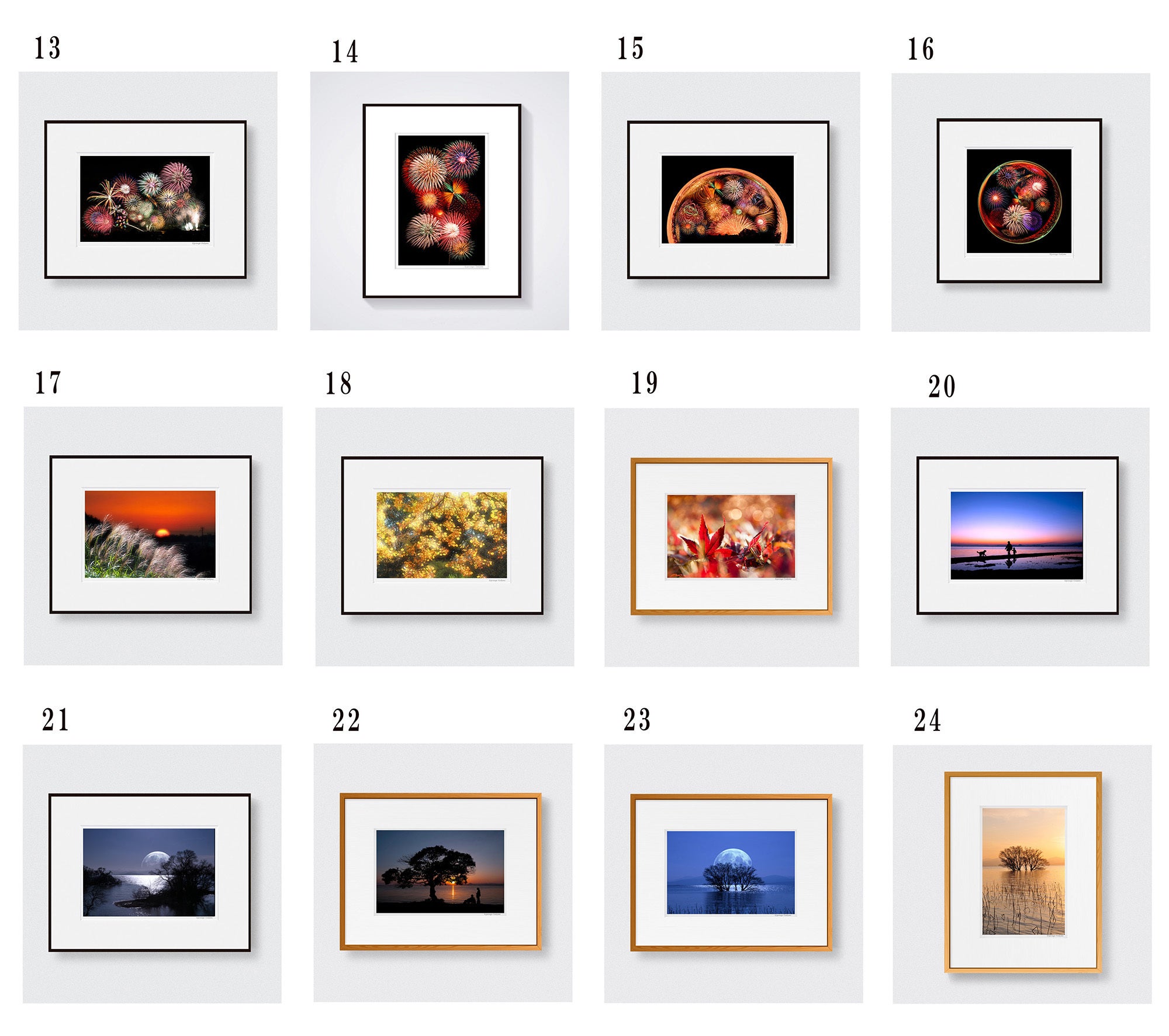 展示作品の中からお好みのものをお選びいただき、顔料インクで2L判(キャビネ)にプリントしたものを八切判サイズ(303㎜×242㎜)の高級フレームに額装し直筆のサインを入れお送りします。※額縁は在庫状況により本ページ掲載画像と異なる場合もございます。ご了承いただければ幸いです。