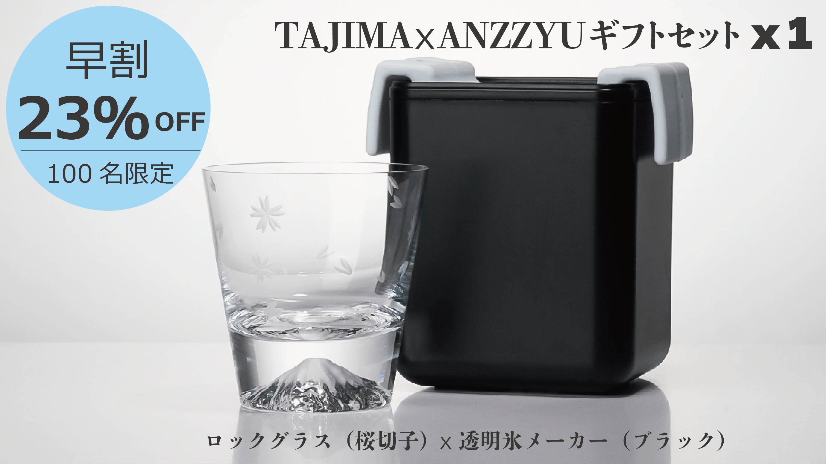 富士山を眺めながら、おいしいお酒を嗜みたい。そんな想いを実現するために、お酒の味をより引き立ててくれる高品質の透明氷(ANZZYU)と富士山ロックグラス(TAJIMA CLASS)のコラボレーション!