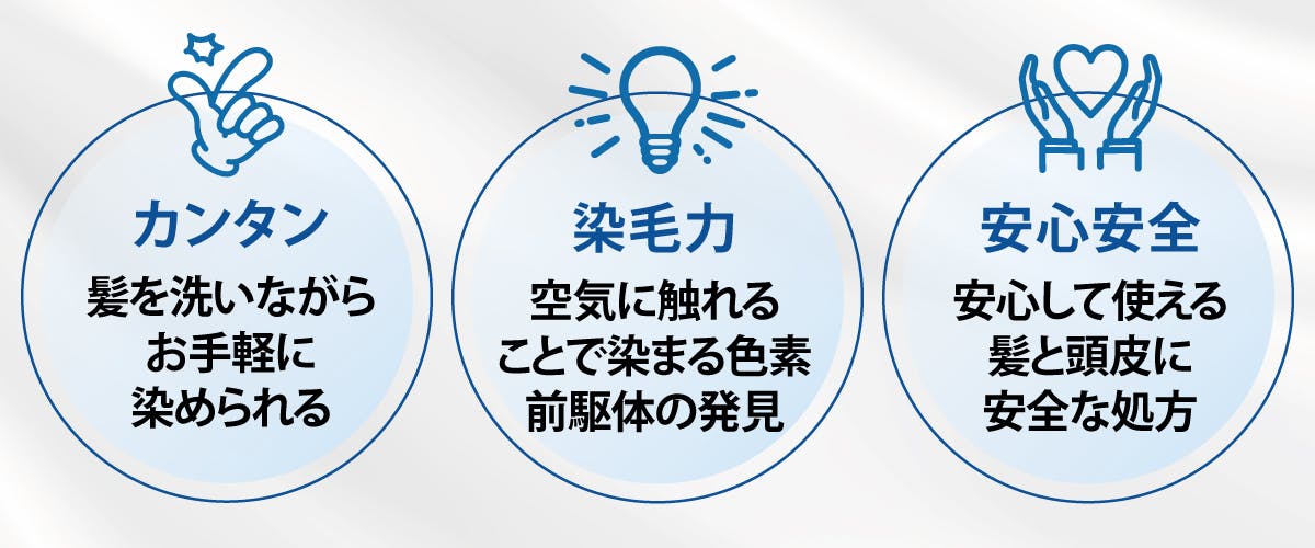 安心安全な色素への想いから発見したのが、「SerenityBlue OxyReact(セレニティブルー オキシリアクト)」技術※です。この発明により、酸素反応によって生まれる青色を実現できました。独自の成分と革新的な技術により、シャンプーするたびに白髪に自然で美しい色合いをもたらすことが可能になりました。