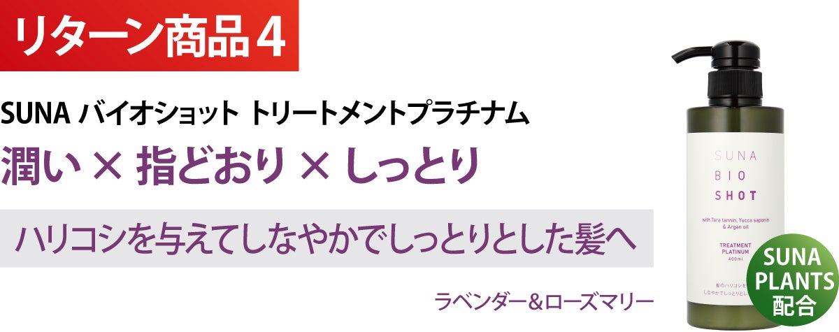 2025/01/05 13:00この度は活動報告をご覧いただき誠にありがとうございます。今回は「SUNAトリートメントプラチナム」についてご紹介いたします。・ハリコシを保ちしなやかでしっとりとした仕上がり・頭皮と髪に潤いを与えるアルガンオイル新配合・オリジナル処方により指どおりがグレードアップ・髪のパサつきや広がりを抑えまとまりのある髪へ・果実エキスを新配合 頭皮と髪の保湿機能を強化・4種類の化学成分無添加(合成香料、鉱物油、合成着色料、パラベン)ご愛用者様のお声を一部ご紹介いたします。「白髪対策としてシャンプーを使っていましたが、手持ちのコンディショナーを使い切ったので同ラインのコンディシヨナーを使い始めました。髪がつやつやで大満足です。静電気も起きません。(50代女性)」「新しくなったトリートメントとても良いです。私はロングヘアなのでトリートメントが必須です。今回新しくなったトリートメントを使ったら髪かサラサラになりました。(60代女性)」何卒よろしくお願い申し上げます。CAMPFIRE SUNA事務局担当:皆川将(shop@nil-co.jp) もっと見る