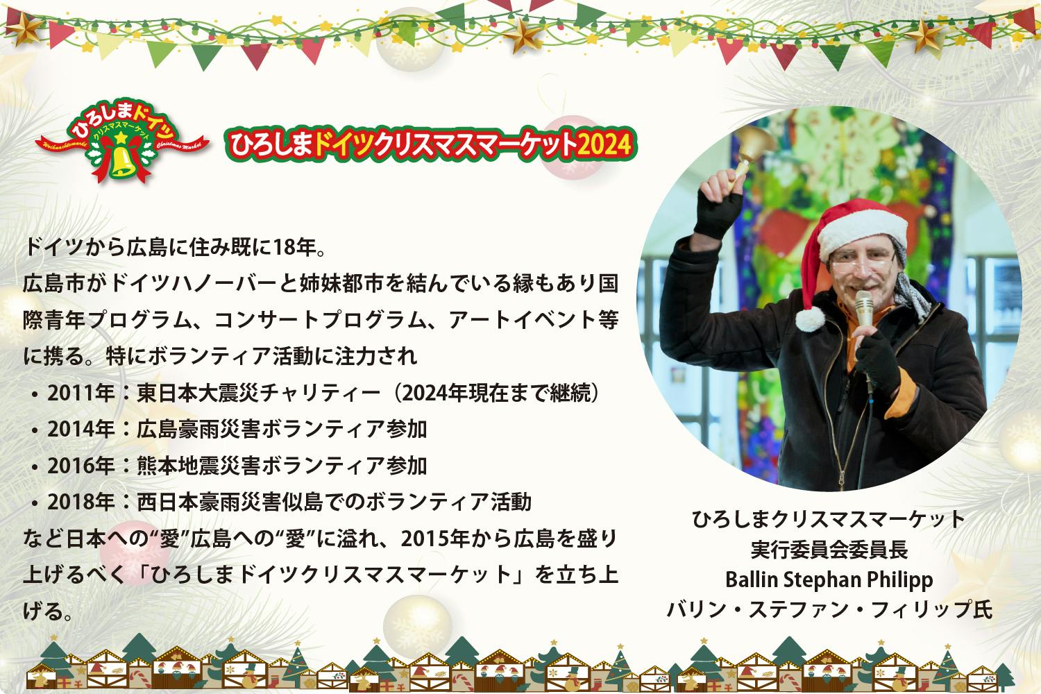 こんにちは、ひろしまクリスマスマーケット実行委員会の委員長、バリン・ステファン・フィリップです。私はドイツ出身で、広島に住んで18年になります。