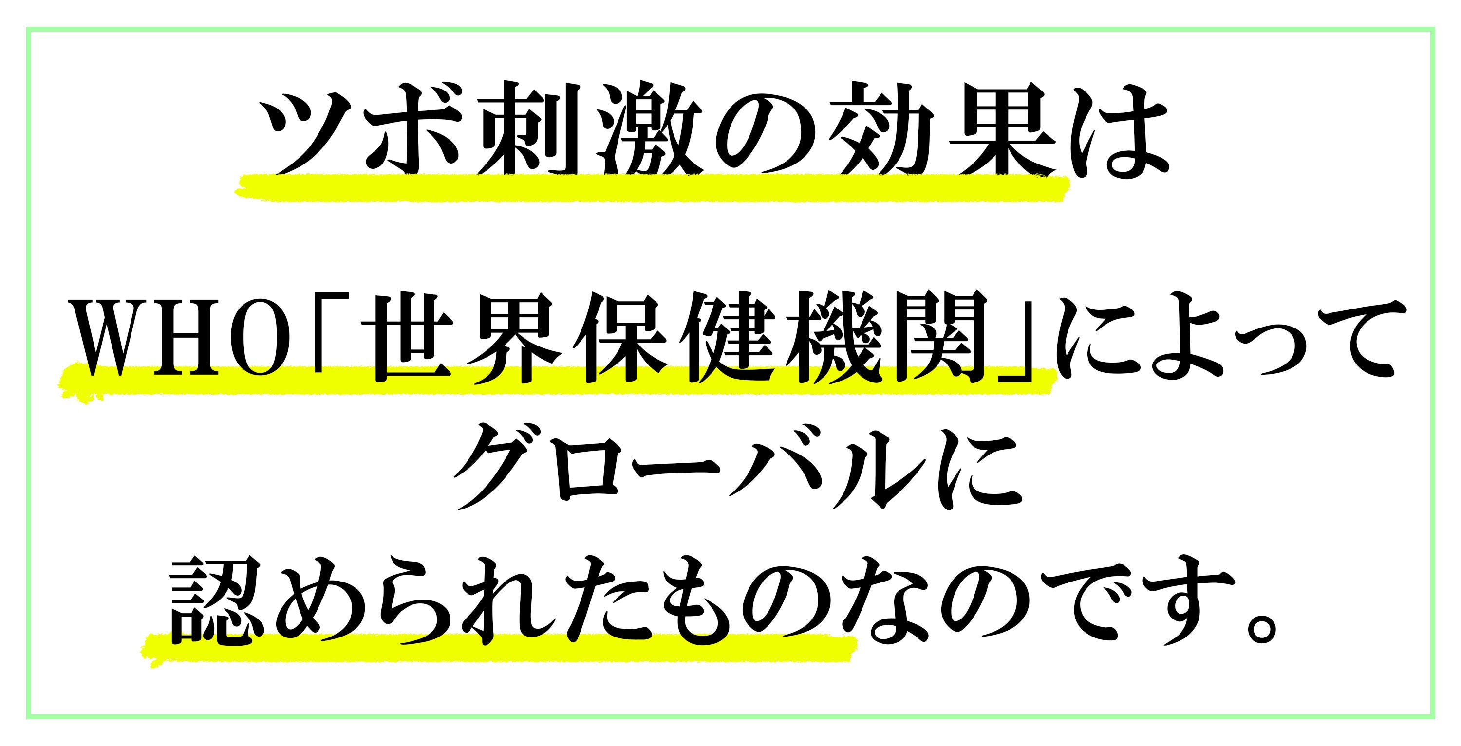 経験の蓄積によって、効果のある位置や扱い方が確立された「ツボ」は、すでにグローバルに認められていて、現在、361のツボがWHO(世界保健機関)によって定められています。