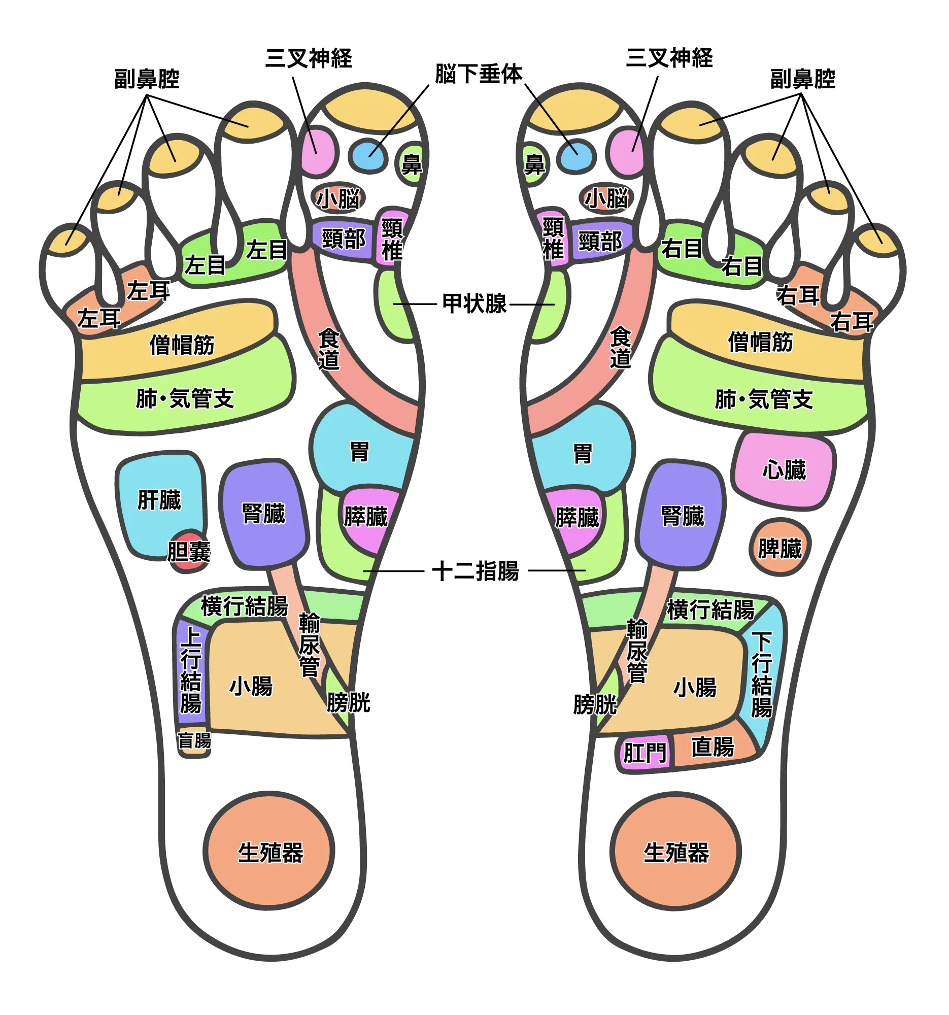 足裏には、60~70個程度の反射区(ツボ)があります。身体の不調が起きた場合、足裏のツボが硬くなったり、カサカサしたり、押すと痛みを感じたりします。この痛みを感じるツボをもみほぐすと、身体の不調を緩和することが可能になります。