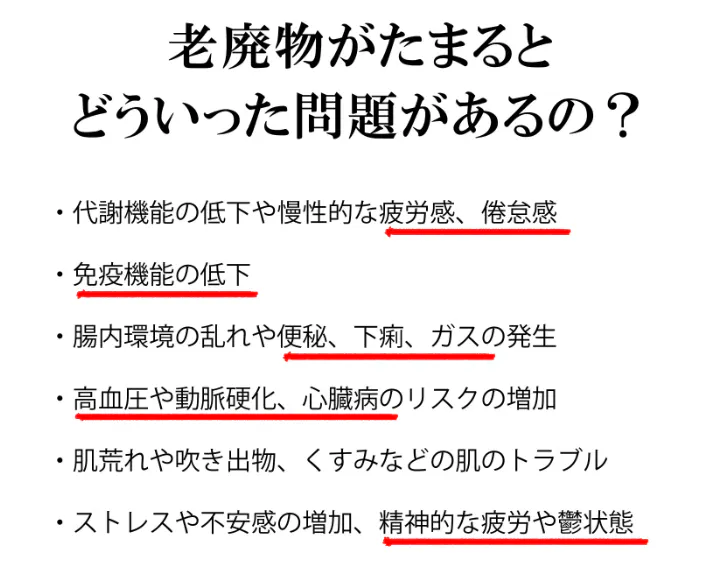 老廃物の蓄積は健康面にも影響を及ぼし、たとえば腸内環境の乱れや代謝の低下などを引き起こします。 これらは便秘や肌荒れ、むくみ、手足の冷えなどの原因になることも。