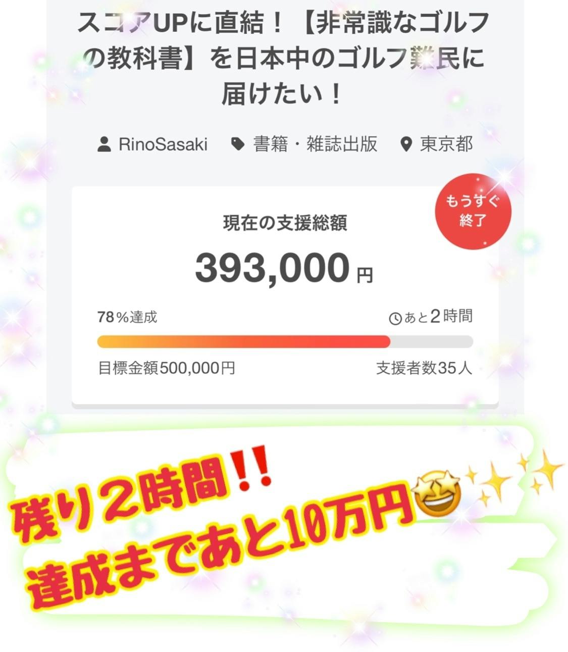 2025/04/20 08:00とうとう残り10日になりました!みなさまからのご支援、応援のお陰様で %まで到達出来ました☆本当にありがとうございます。とても勇気づけられています!現在はリターンを随時実施中です。このプロジェクトをより多くの方に見て頂き今までにない変わった切り口のゴルフの教科書が日本中に届くようにSNS拡散など、みなさまのお力を貸していただけませんでしょうか?頑張りますので、助けてください!ご協力をお願い致します。プロジェクト詳細はこちら↓https://camp-fire.jp/projects/805293/view もっと見る