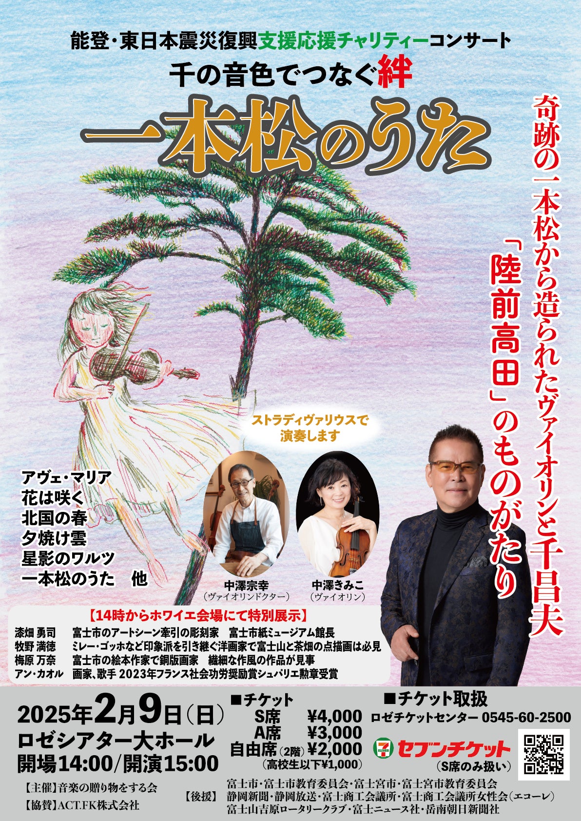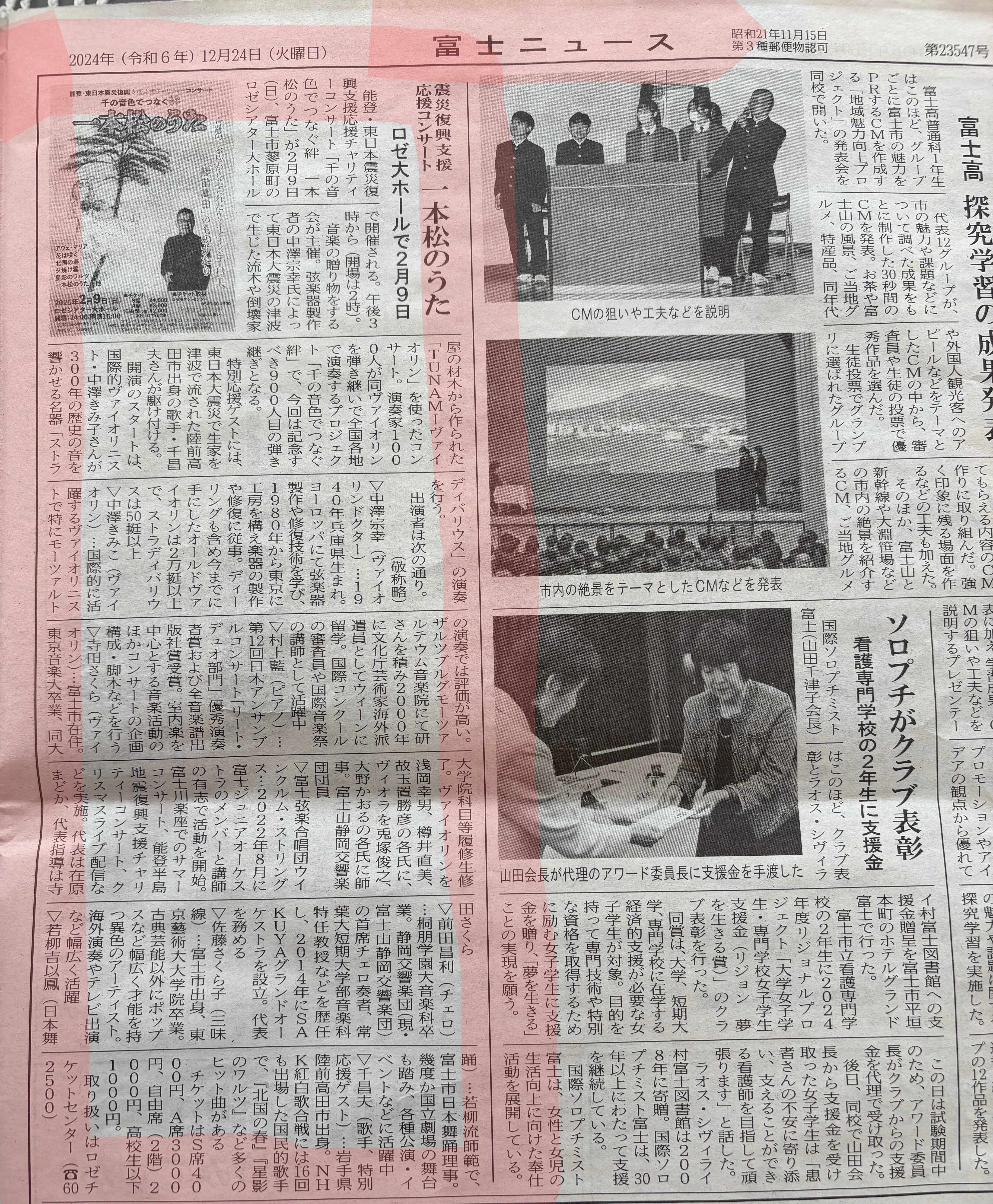 「一本松のうた」静岡公演が12/24日の富士ニュースさんに記事として掲載されました!富士ニュースを購読されている方はぜひ現物をご覧ください!千昌夫さんとTSUNAMIヴァイオリンの奇跡の共演をご期待ください!まだまだご支援お待ちしております!