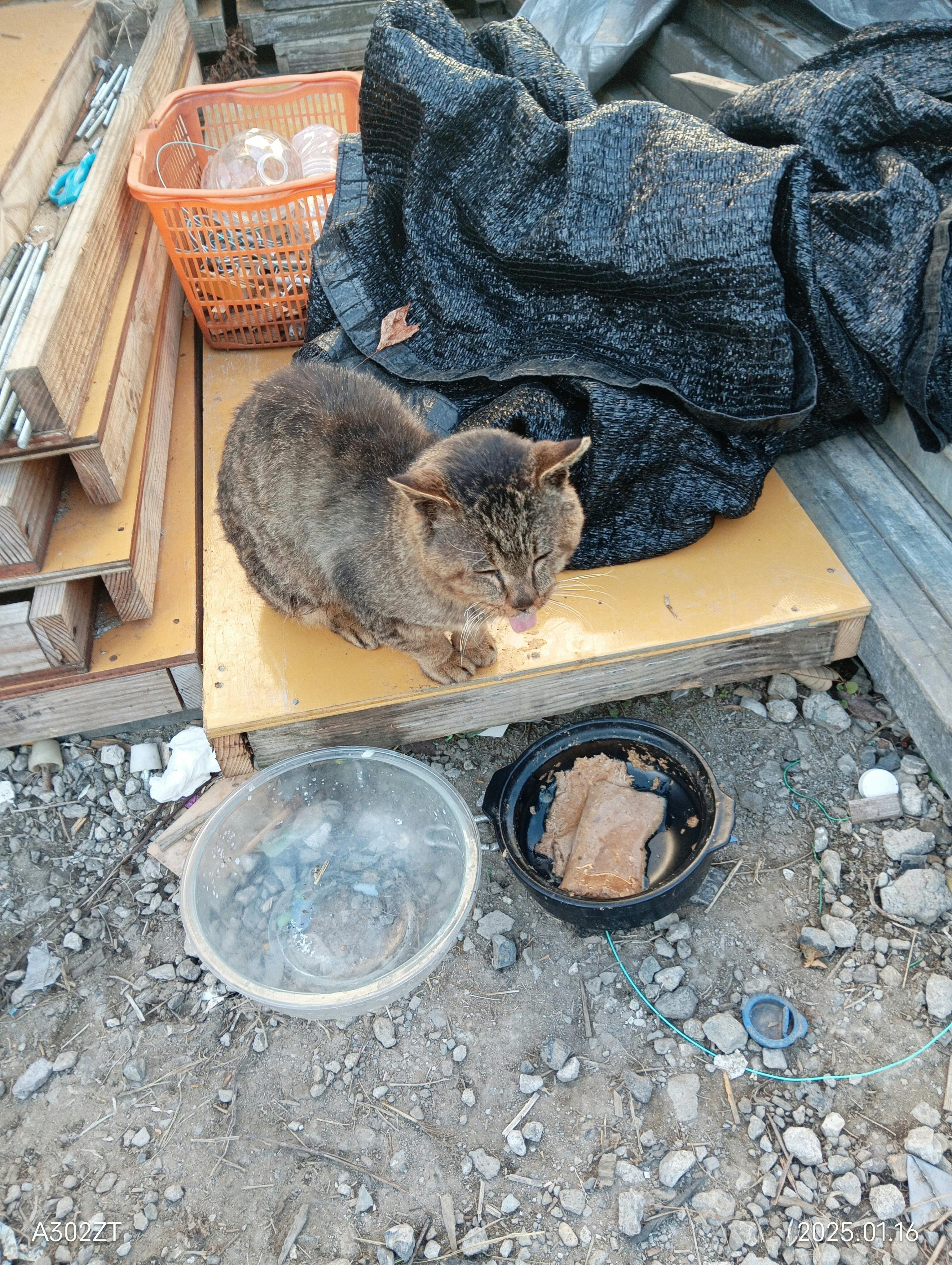 足に大怪我をしている野良猫のボス君の場所に朝と夕方と行きます。
