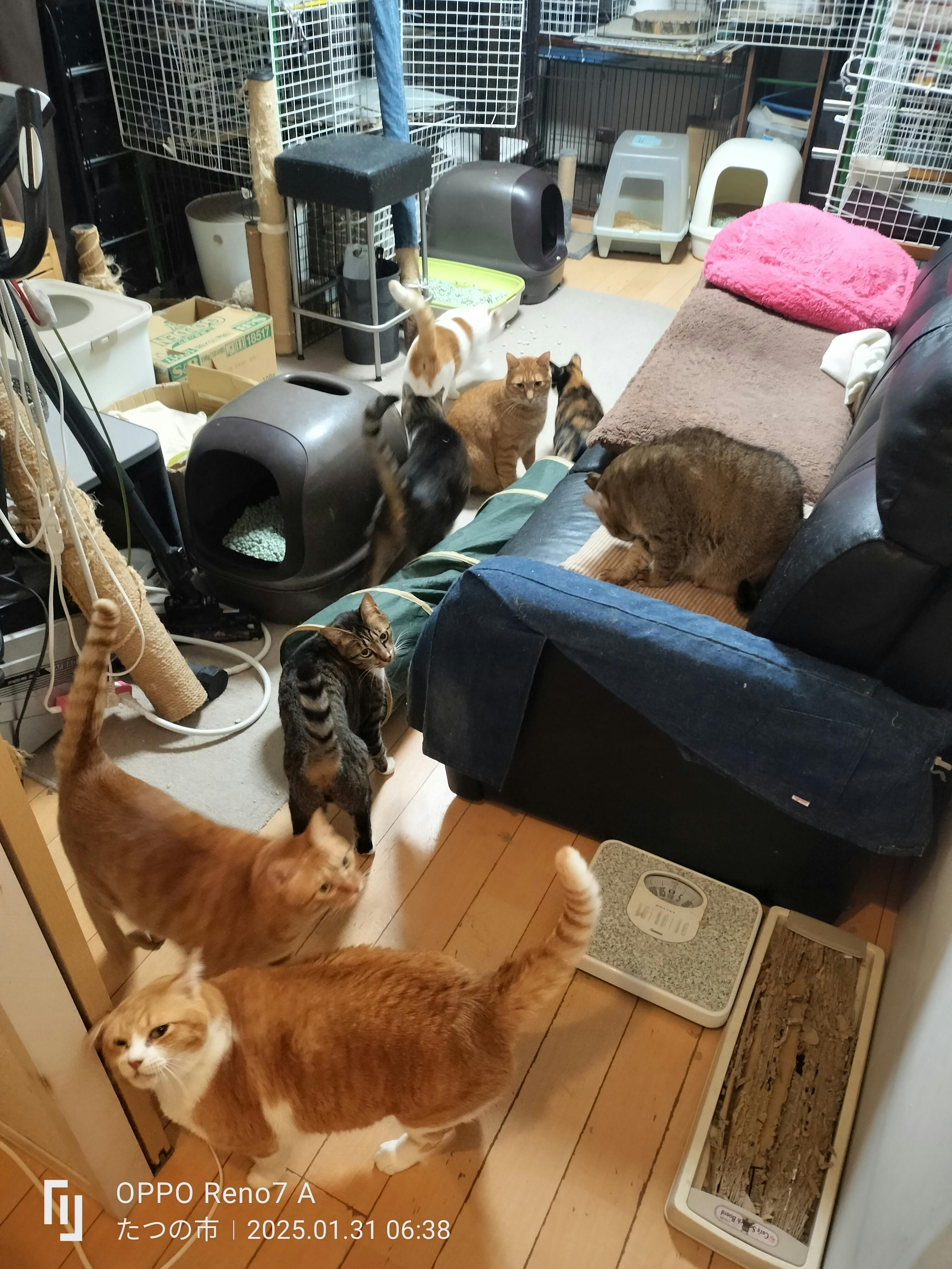 老猫達やまだ若い里親さん待ちの子達の朝のご飯の用意