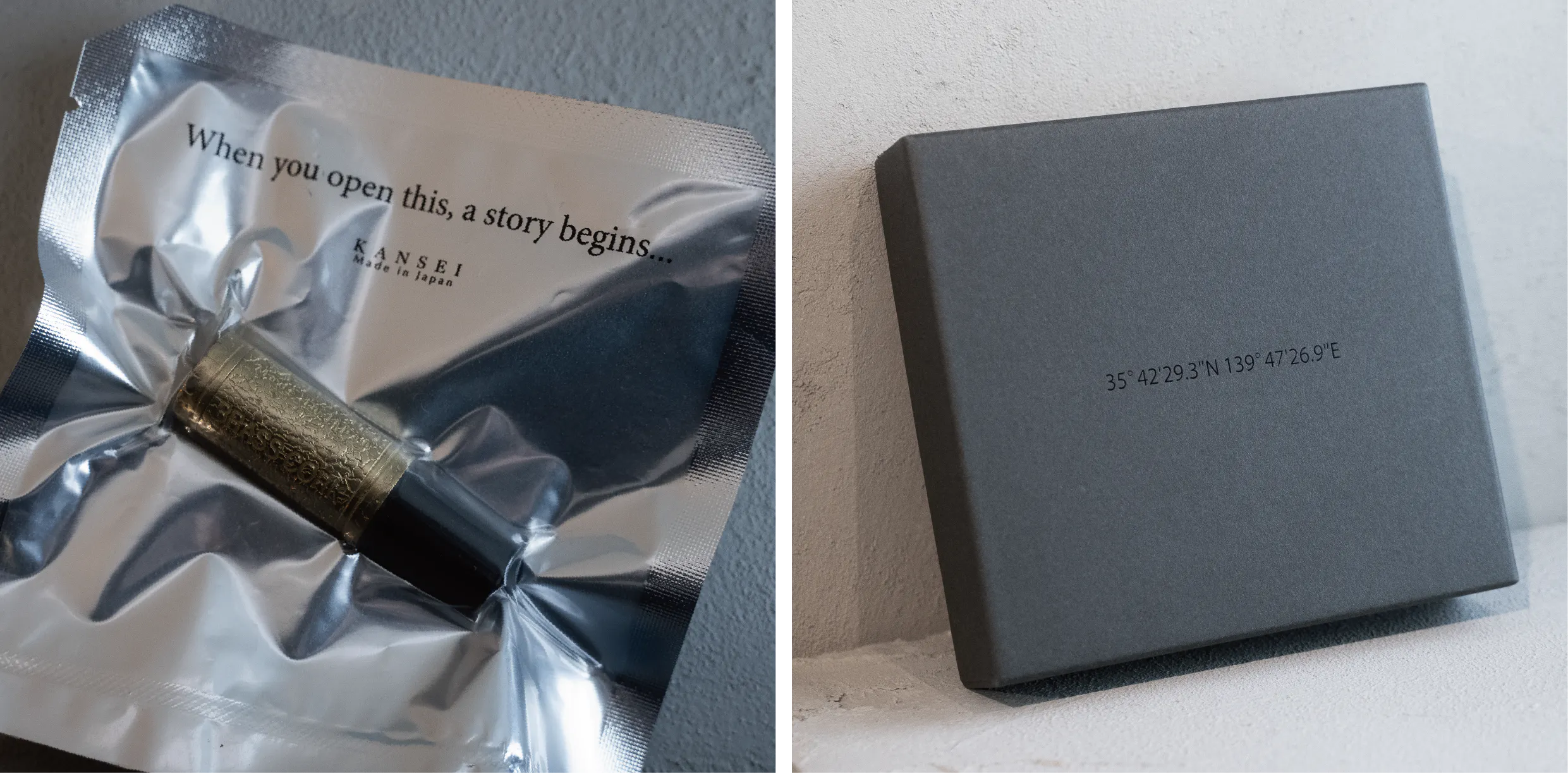 「KANSEI Made in Japan」の商品やパッケージには、製造された土地のGPS座標が刻印されており、そのGPS座標をネットで検索すると、日本国内のどこで製造されたかがわかるようになっています。