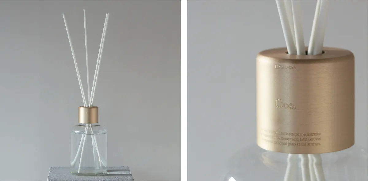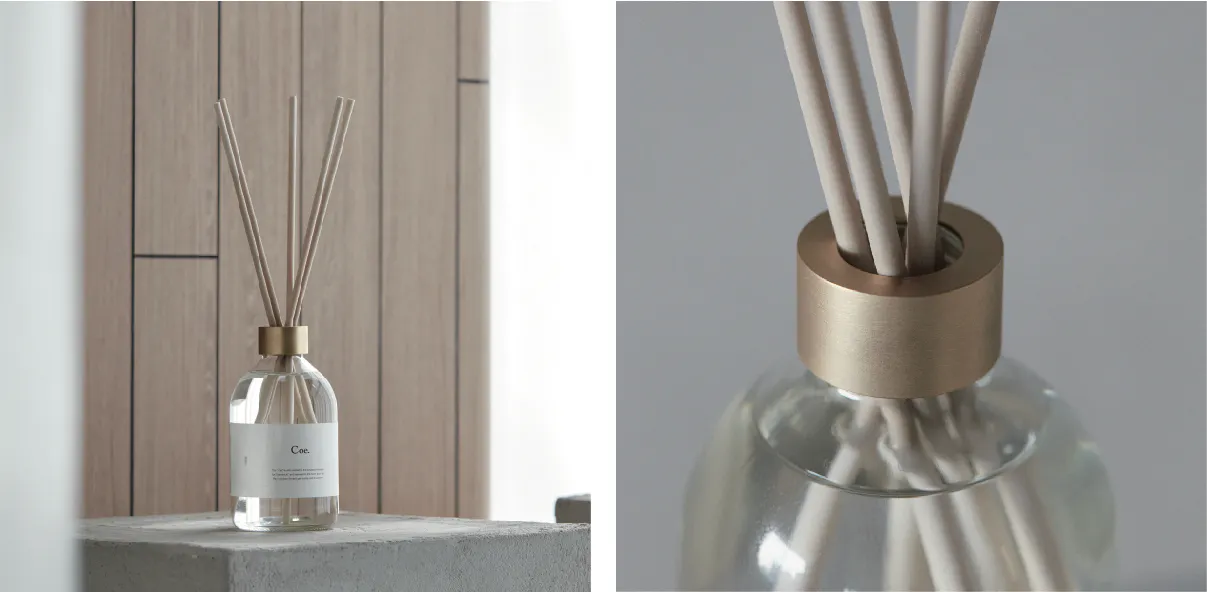 フレグランスブランド「Coe.」は、日本国内で丁寧に製造される香料と、真鍮の切削技術を生かしたパーツからなっています。