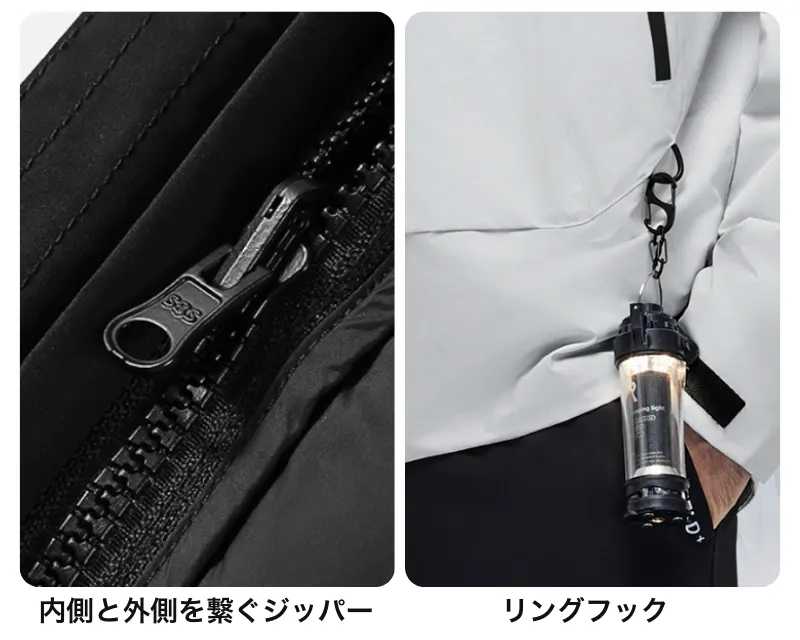 一般的に風速1m/sで体感温度が1℃下がると言われています。断熱性が優れていても、雨風をしのげなければ寒さを感じてしまいます。「3IN1エアジャケット」では、断熱性だけでなく防風性、防水性に優れた素材を使用しています。