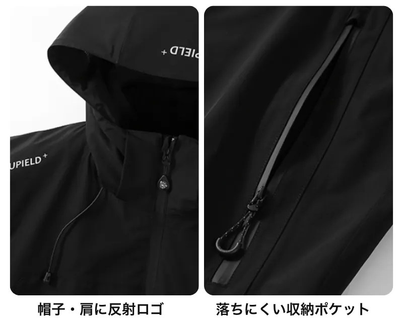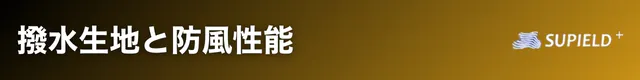 防水透湿性素材を使用し、通気性抜群のため、アクティブに動いても汗をかいてもムシムシしない構造となっています。この外側からは防水仕様、内側からは通気性抜群という両面でのいいとこどりの機能で、服の中が蒸れにくく快適に過ごせるようになっています。