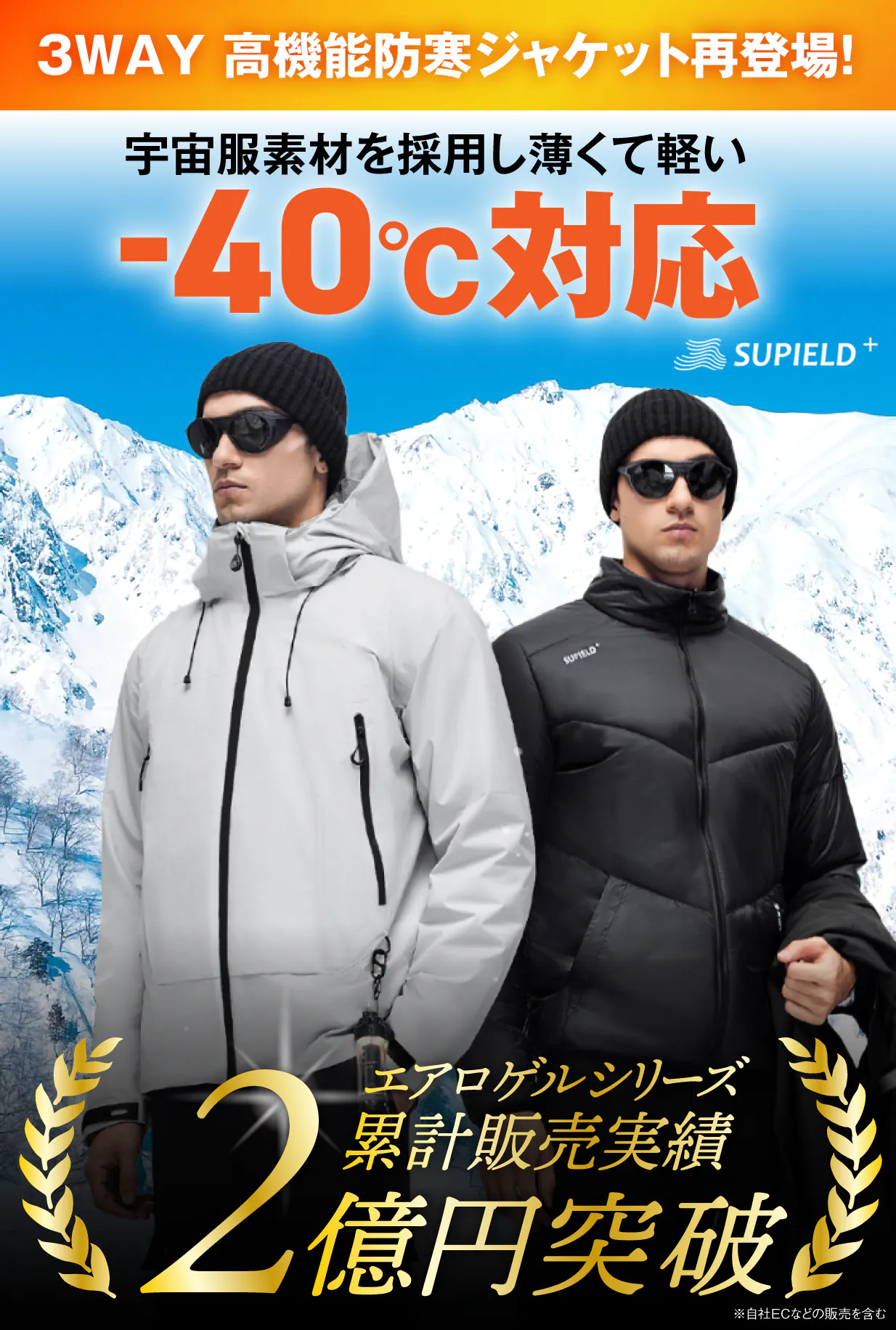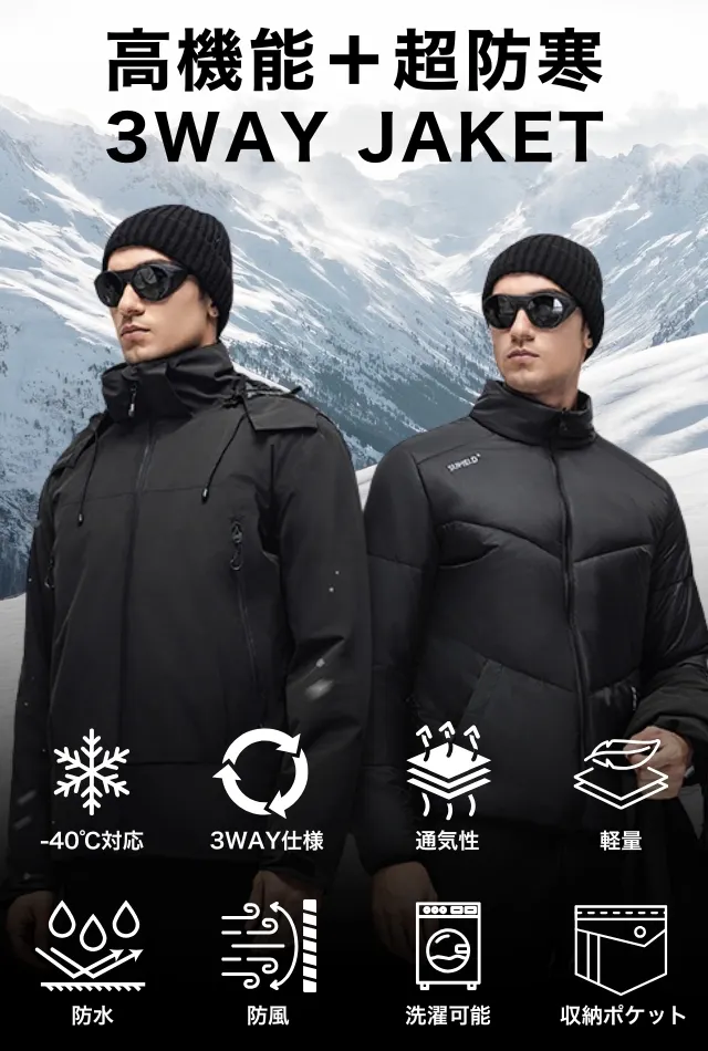 「宇宙服素材エアロゲル」を採用した高機能防寒3WAYジャケット登場!アウターとライナーダウンを専用のファスナーで連結し、1着3通りの着こなしができる3WAY仕様に進化!