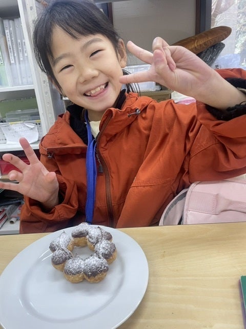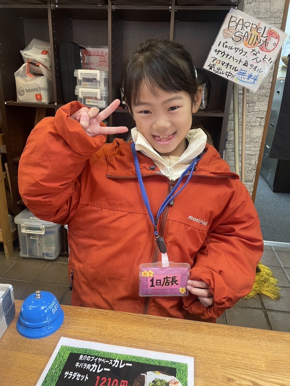 ほぼ丸一日頑張ってくれたので、いぶき温泉シェフ特製手作りポンデリングを食べて笑顔のあおな店長