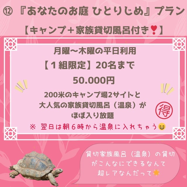 こちらは平日限定プランとなりますが、なんとこれまでのいぶき温泉オートキャンプの定休日返上‼︎月曜〜木曜でのご予約OK‼︎