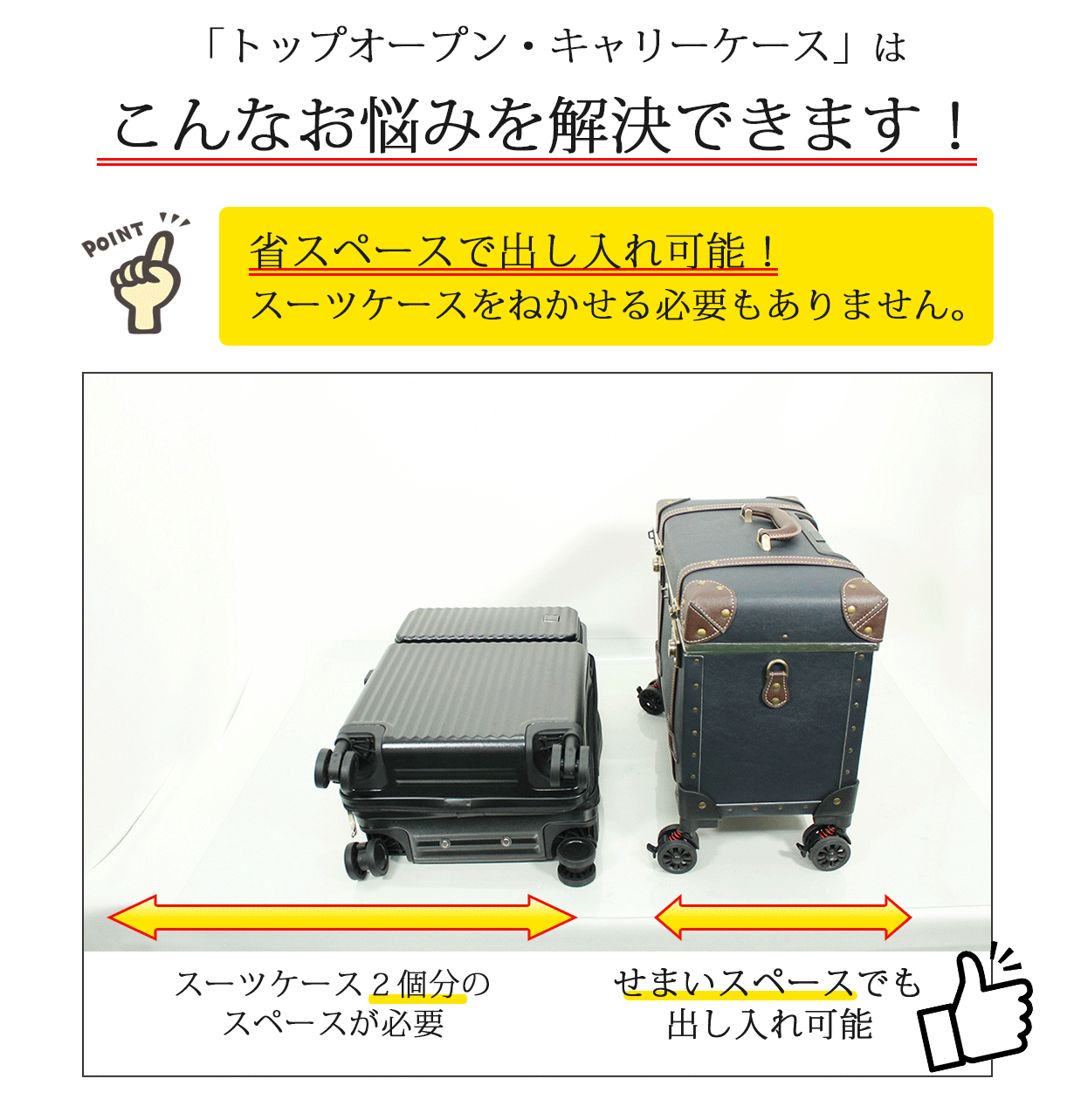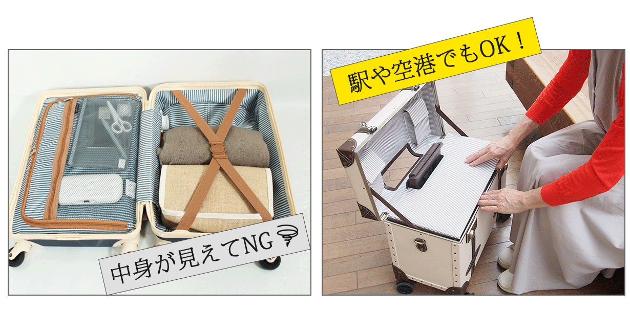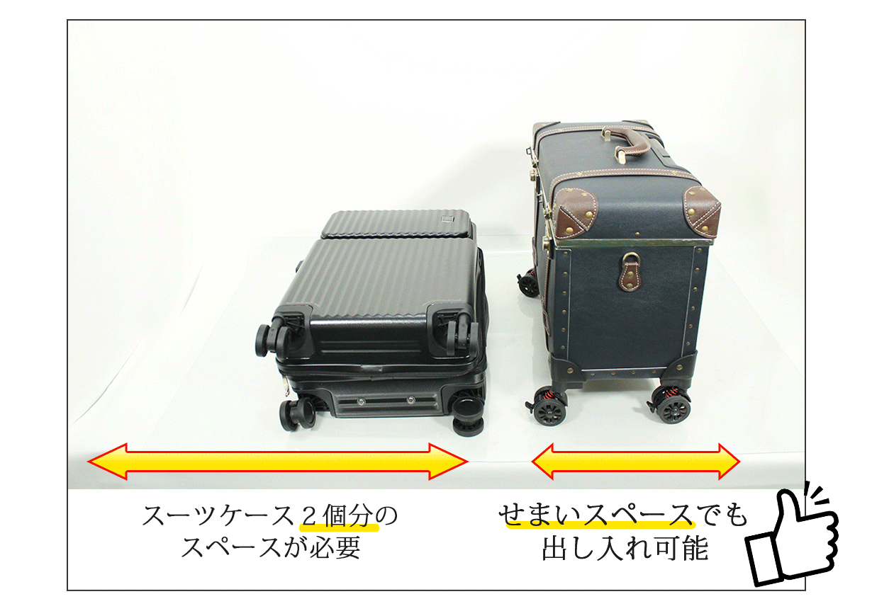 また、スーツケースをねかせることなく取り出せるので、場所を取らず、周りの目も気にせず開閉出来て便利。
