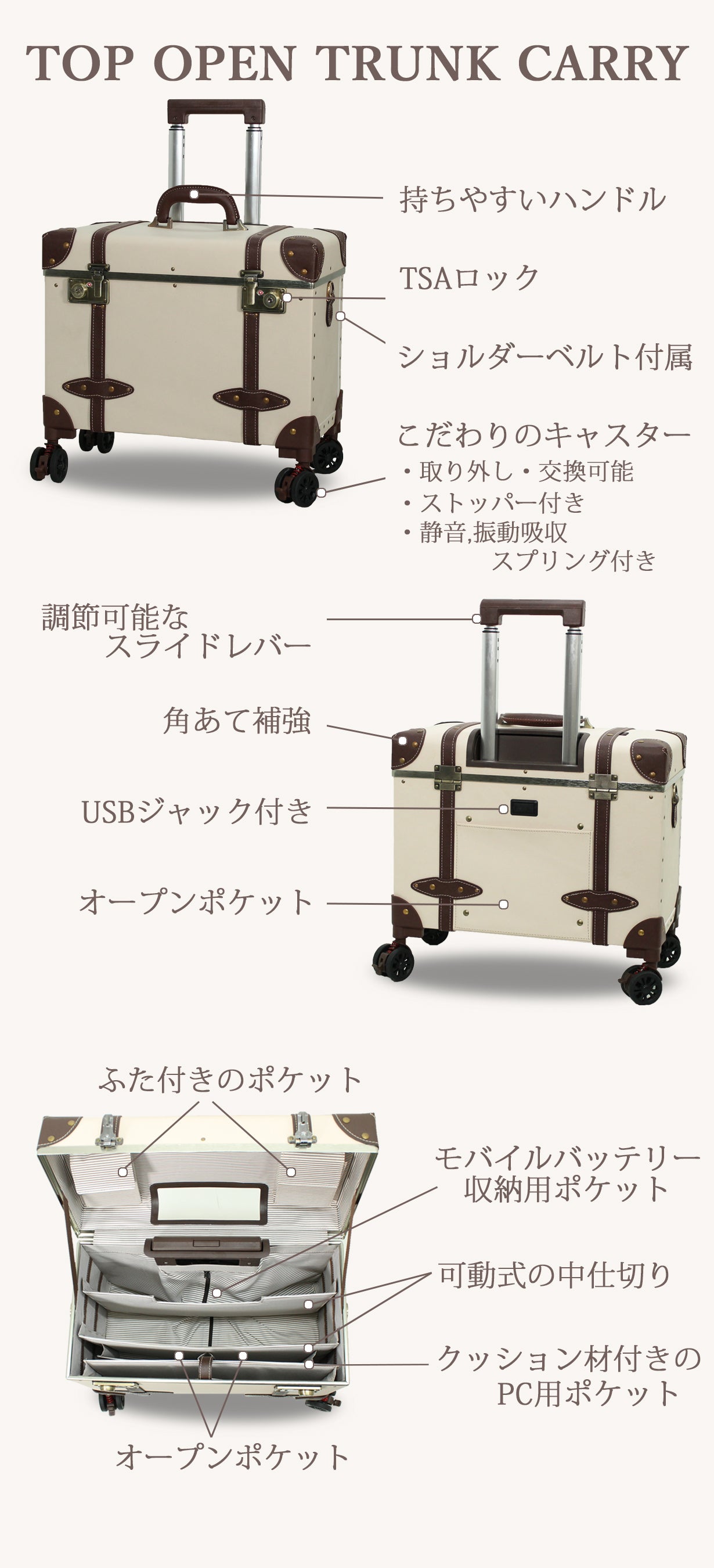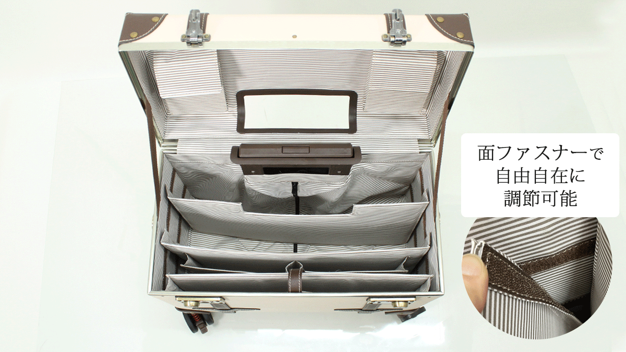トップオープン・トランクキャリーは、長年培ってきたノウハウを生かし、作り上げた商品となりますので、旅行やお仕事の相棒として末永くお使い頂ける商品と考えております。