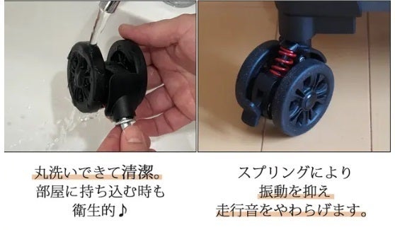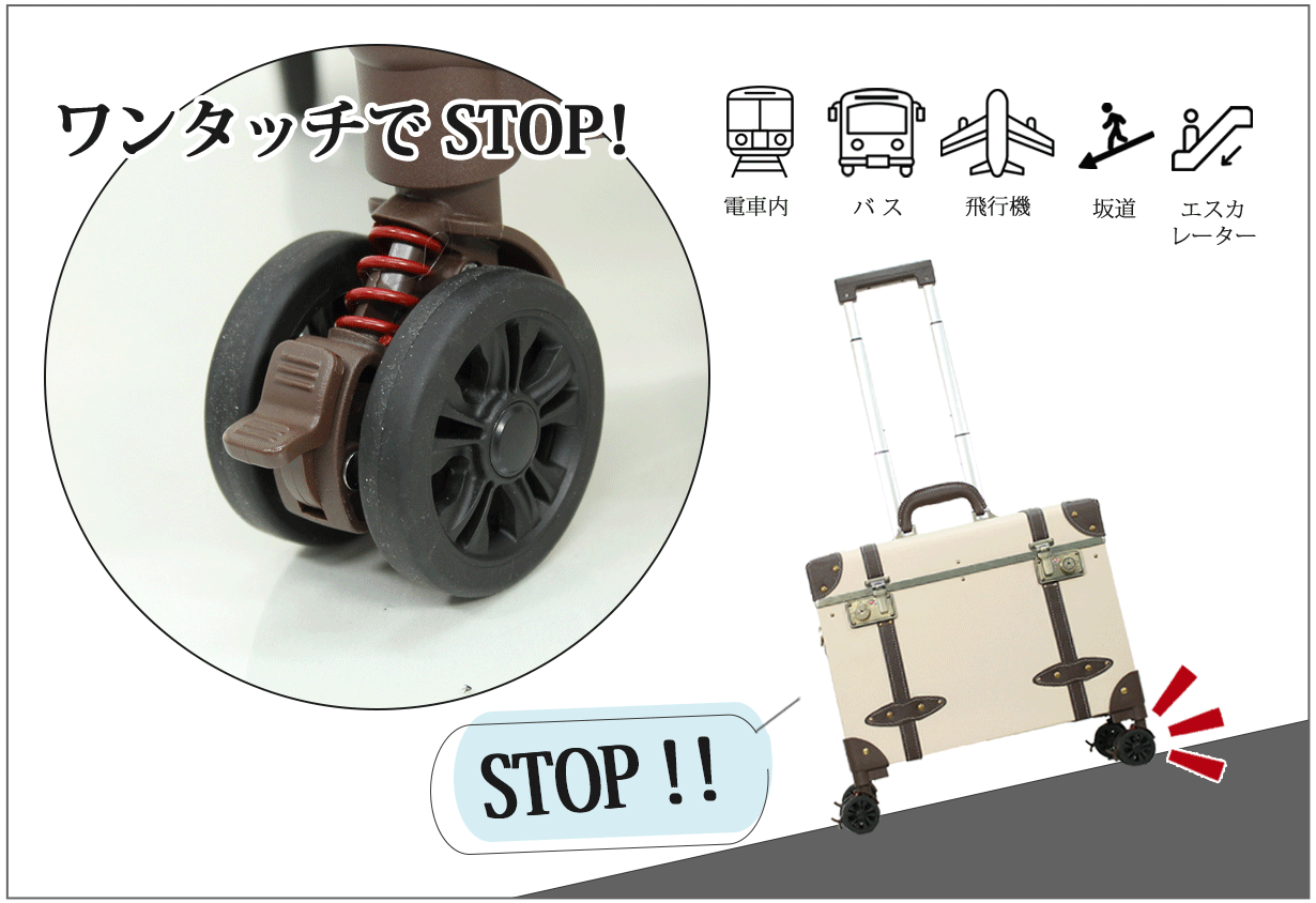 電車内や坂道で・・スーツケースを支えておくのは大変!そんな時にはキャスターストッパーが便利!移動中の不便もストッパーで解消!